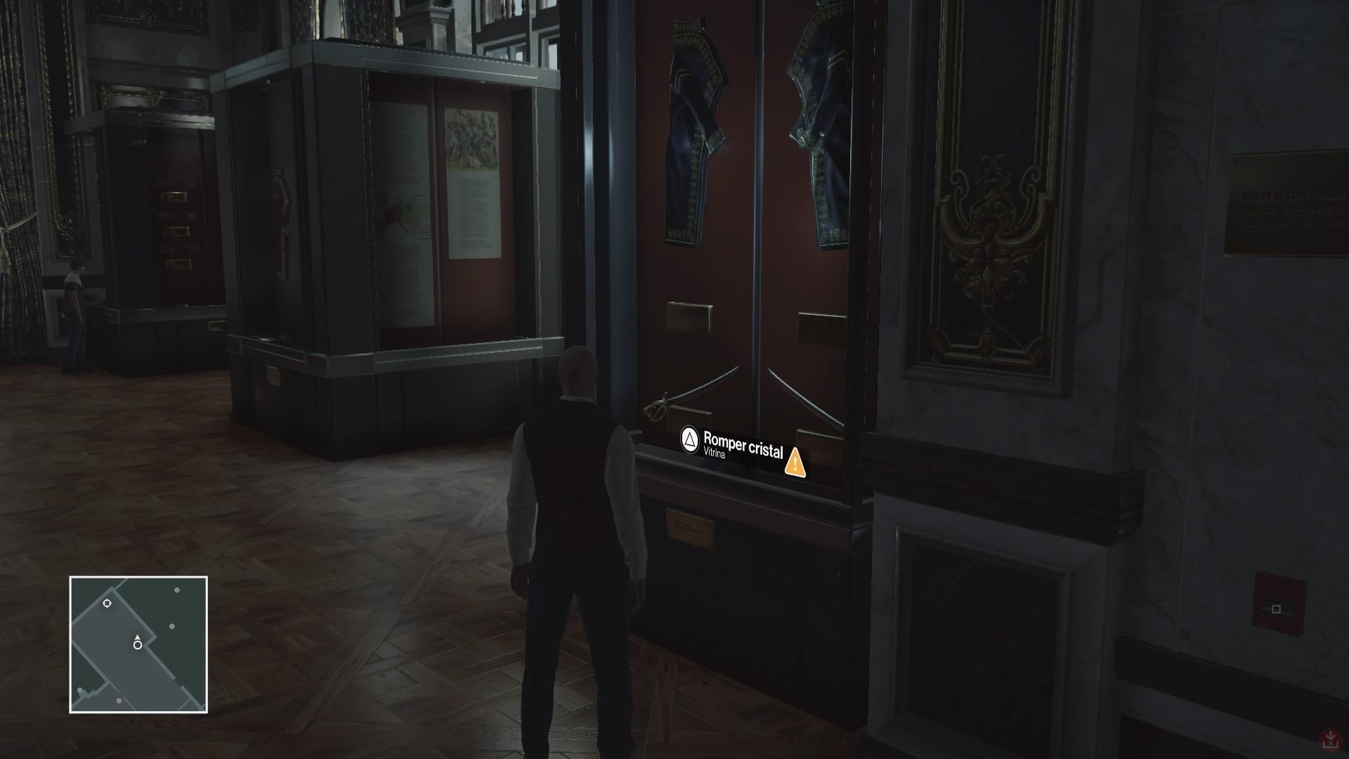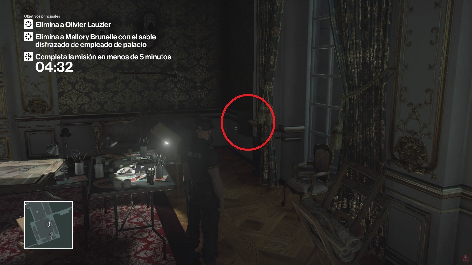 En planificación de la misión cambia la ubicación inicial a infiltrado en la cocina. Ve hasta la entrada principal y entra por una de las puertas laterales que llevan al objetivo. Busca el sable en los expositores y rompe el cristal para hacerte con el arma.
