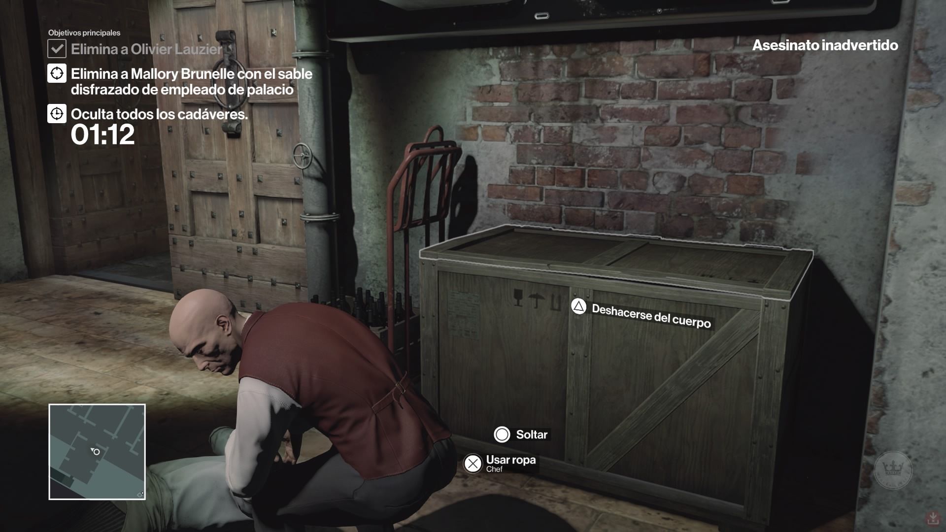 Repite los mismos pasos del nivel anterior asegurándote de que escondes el cuerpo de la víctima en la caja que hay en la sala.