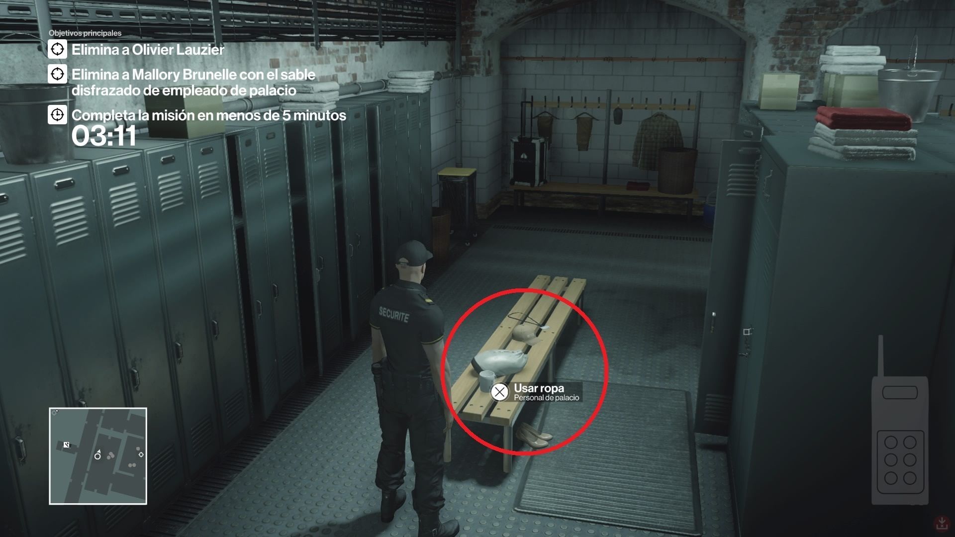 Lleva equipado el dispositivo para cruzar las puertas con láser. Dirígete a la entrada principal y, si te encuentras con Novikov, vigila que su guardaespaldas no te vea. Ve por la puerta que hay bajo las escaleras centrales y que lleva al sótano. Una vez abajo, dirígete al vestuario y consigue la ropa de personal de palacio.