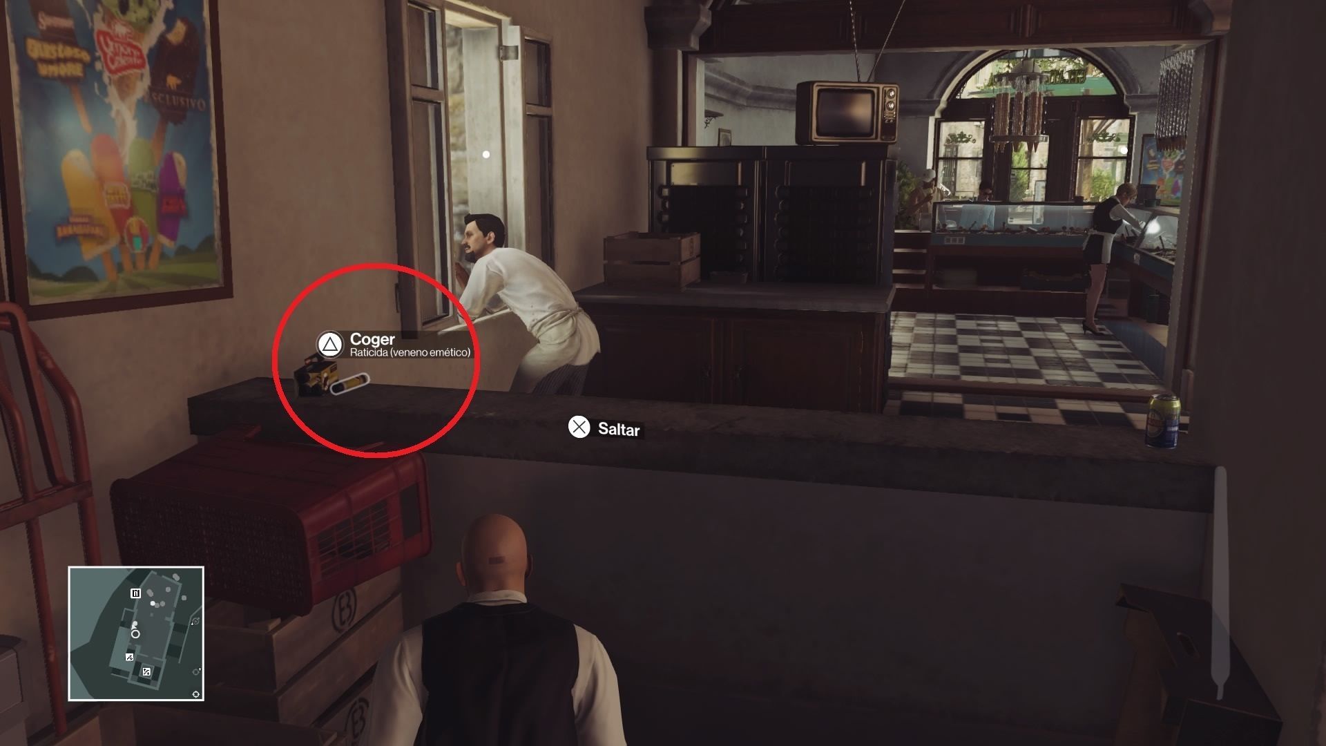 Dentro verás un ayudante de cocina. Puedes ignorarlo, a no ser que quieras conseguir la llave del ayuntamiento. Sal por la puerta que hay al lado de la que has entrado, sube las escaleras y abre la segunda puerta que te encuentres. Estarás dentro de la heladería, en la parte trasera de la tienda. Sin que te vean, coge el raticida que hay sobre la repisa.