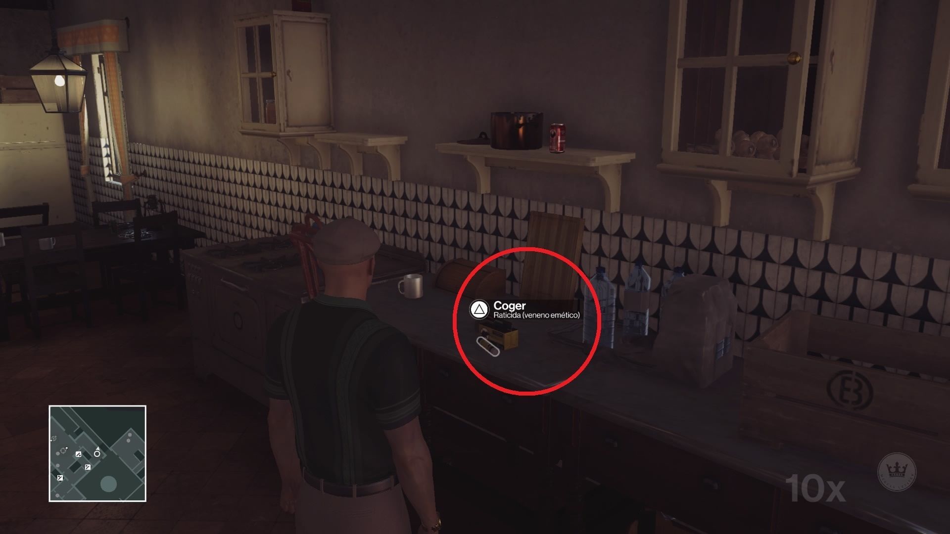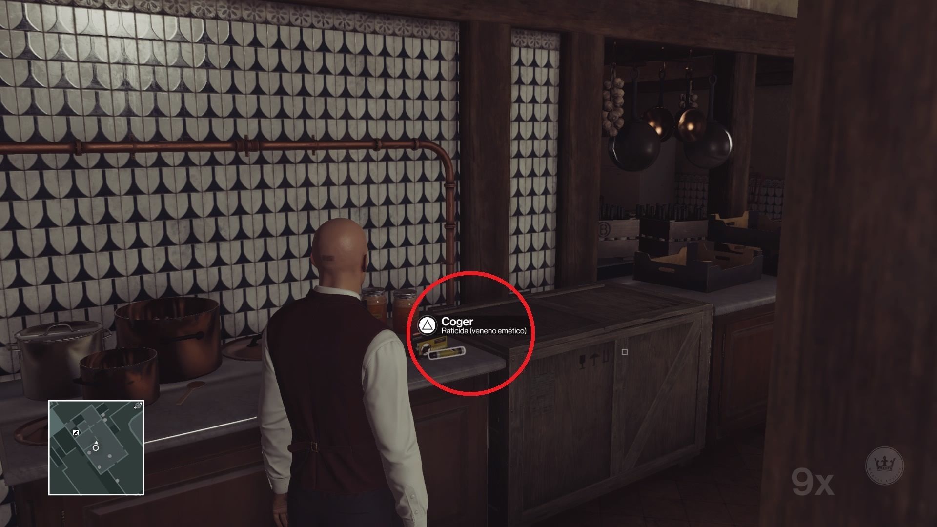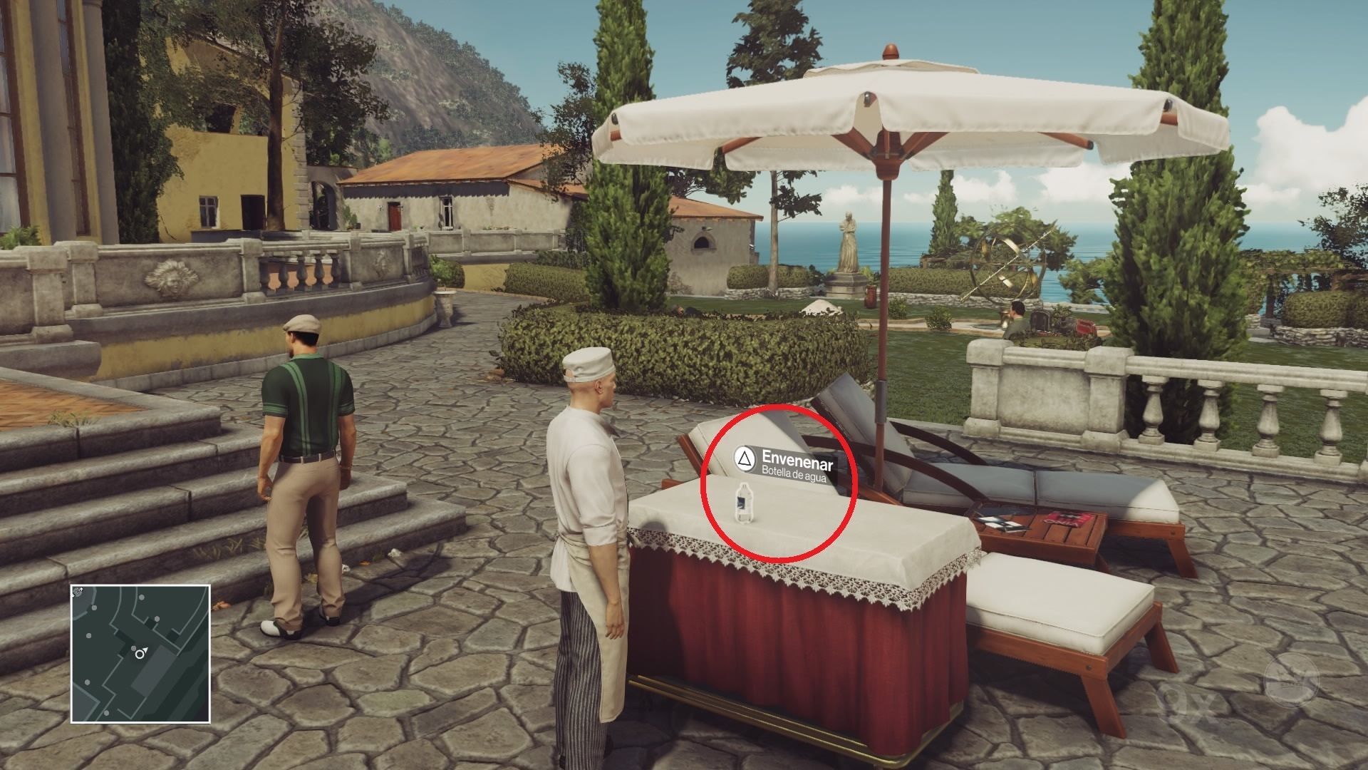Ve a la parte trasera de la cocina y activa la radio. El chef de la mansión se acercará a investigar. Aprovecha para atraerlo hasta la habitación contigua y acabar con él. Vístete con su ropa y dirígete al jardín de la mansión, al lado de la piscina. Verás una mesa junto a dos hamacas. Introduce el veneno en la botella de agua y espera a que el entrenador de golf se la tome.