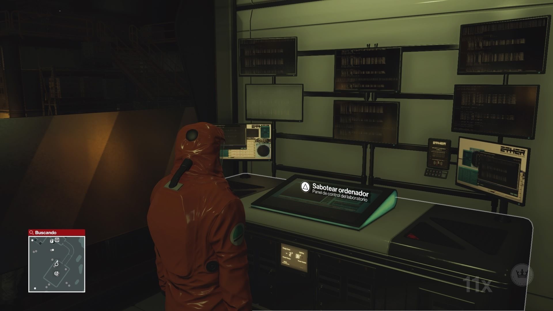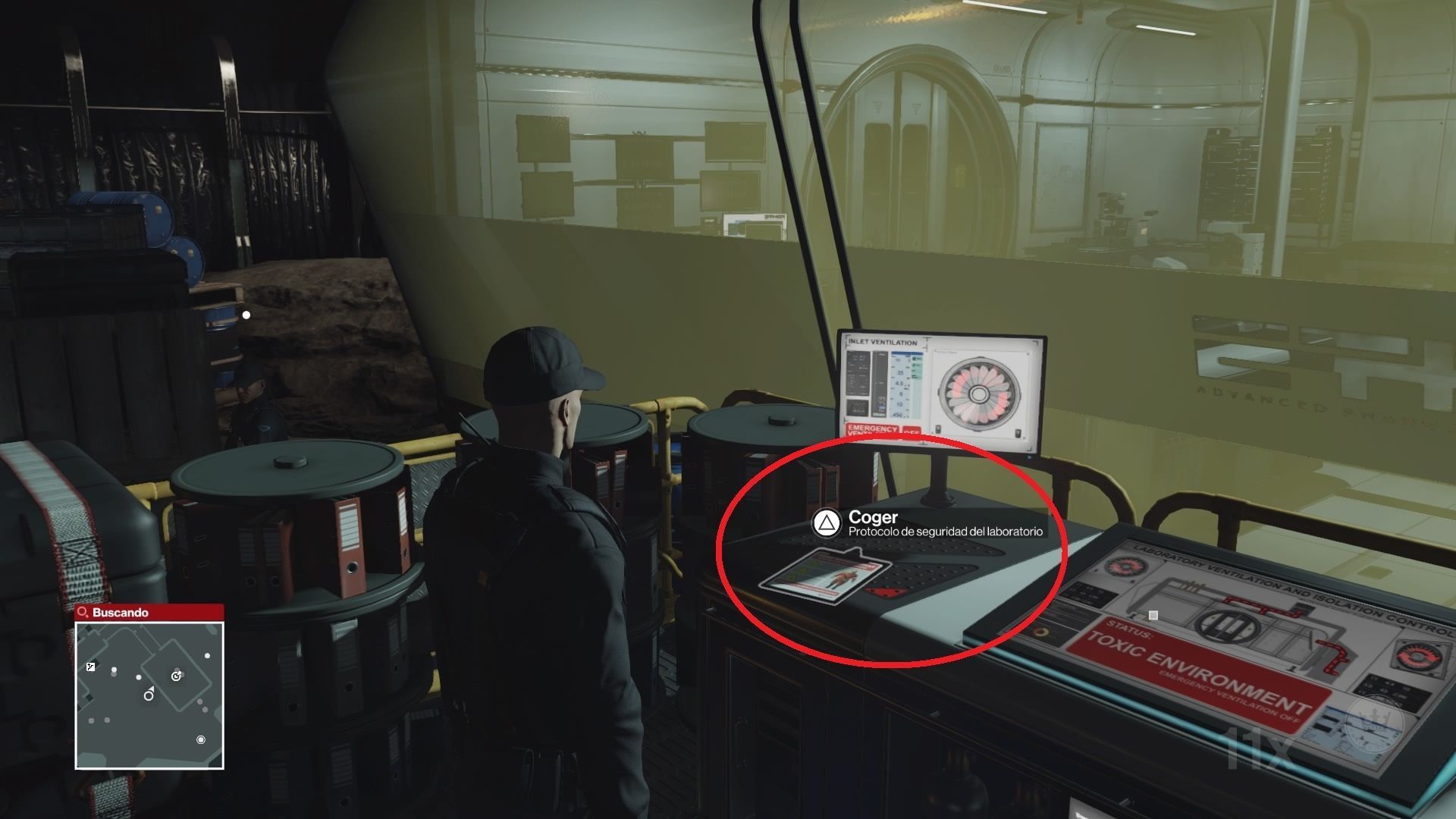 Baja por el túnel que tiene escaleras y desplázate sin ser visto por los guardias que te pueden reconocer. Ve hacia el centro del laboratorio, donde verás una plataforma con paneles justo delante de la cápsula que contiene el virus. Coge el protocolo de seguridad del laboratorio para activar la oportunidad "Entorno hostil".