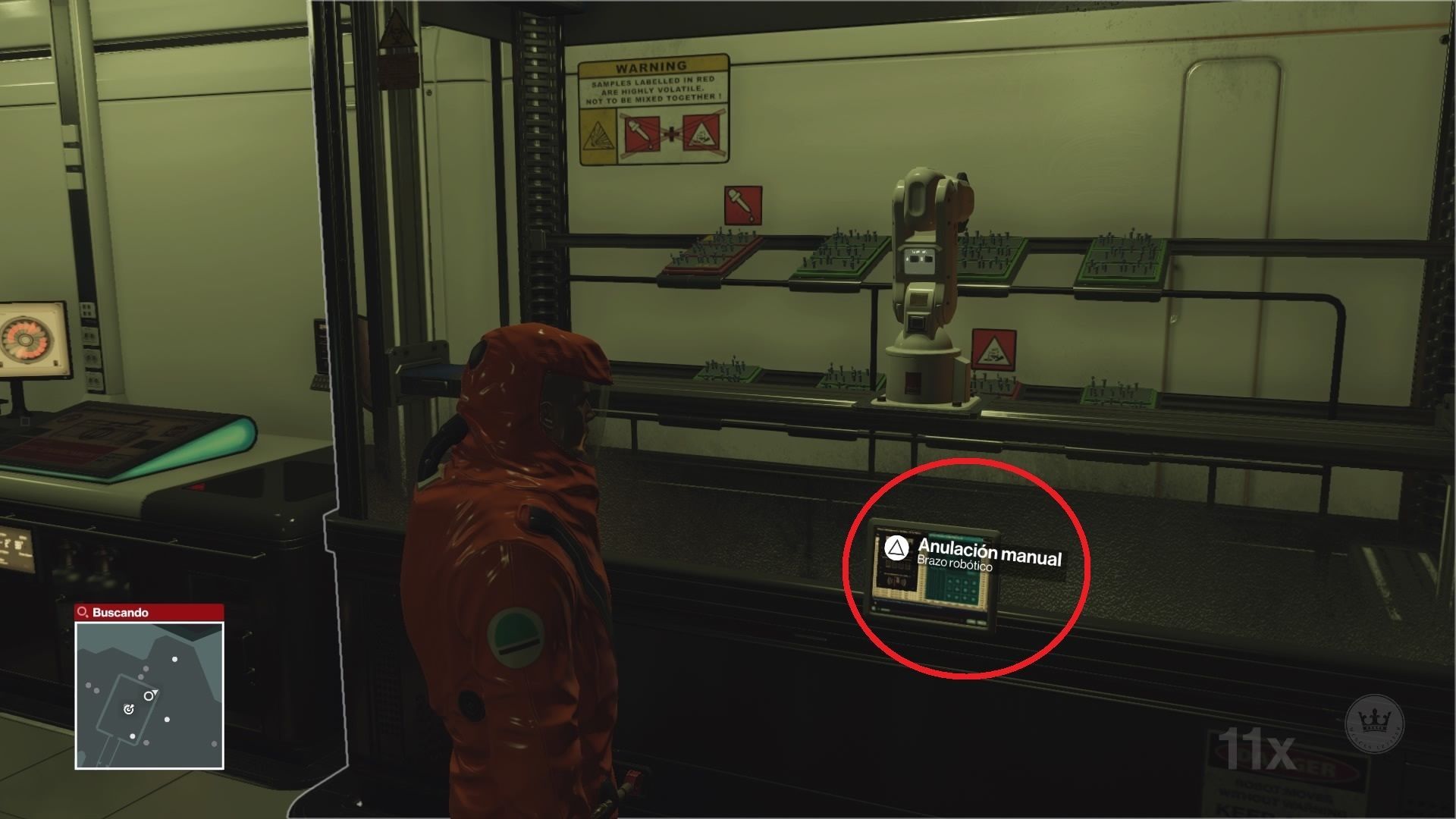 Acto seguido, apártate del ordenador y deja que investiguen la zona. Ahora ve al otro lado del laboratorio, donde verás un brazo robótico. Interactúa con él y coge una muestra de las dos bandejas rojas.