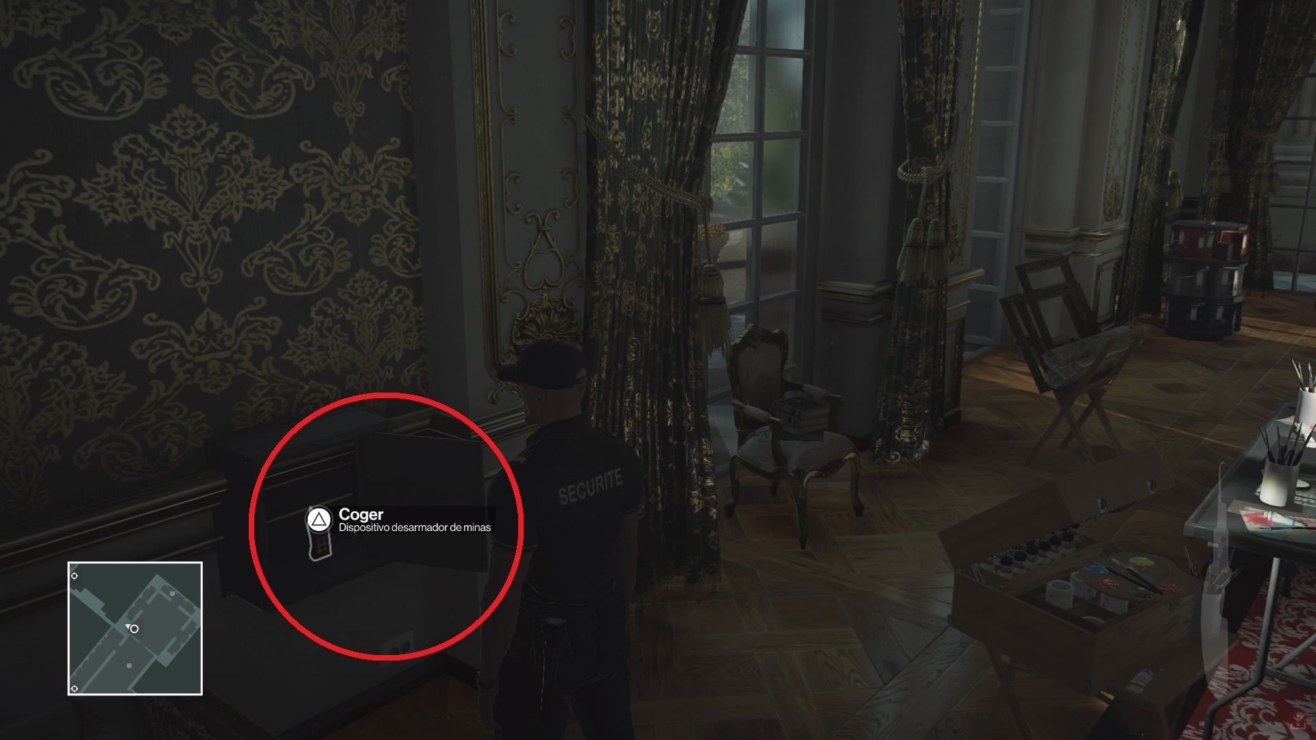 Empieza la misión desde el ático y con la ganzúa en tu equipo inicial. Baja por las escaleras, acaba con el guardia, ponte su uniforme y piratea el portátil. Al lado de una de las ventanas verás una caja de metal. Ábrela con la ganzúa y coge el mando que hay en su interior.
