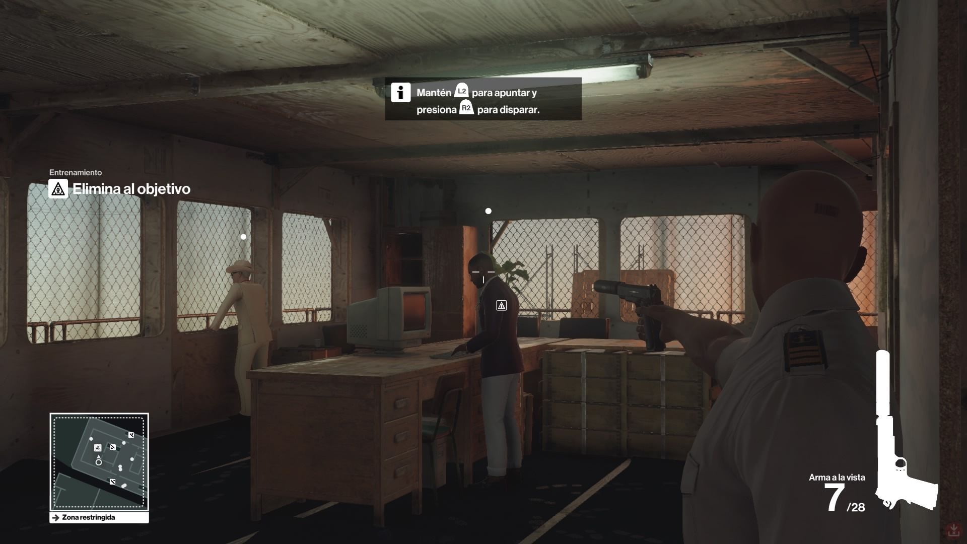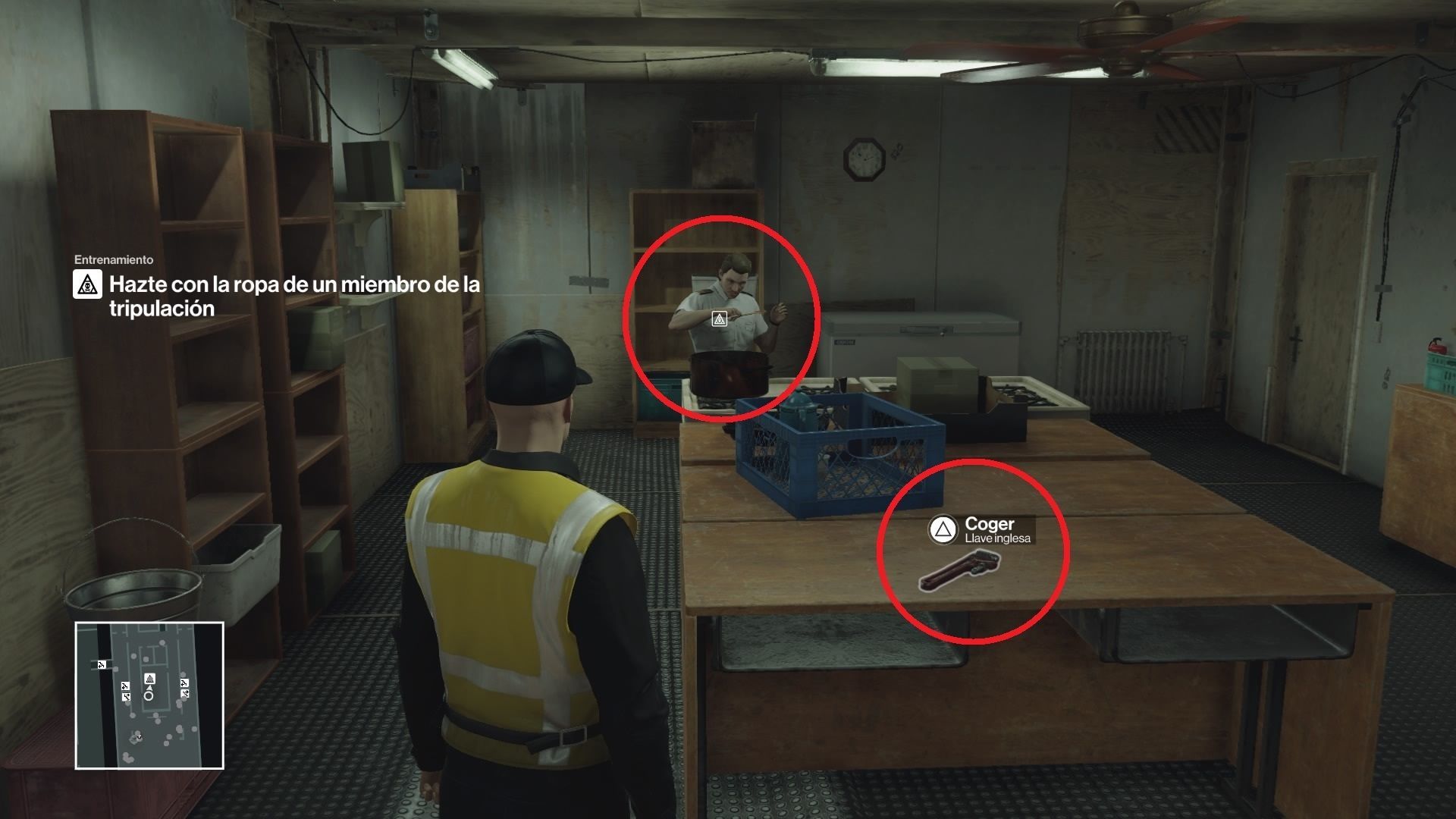 Sal del baño y dirígete a la izquierda para acceder al interior del yate por el montacargas. Verás tres operarios al otro lado. Vigila todos los personajes que tienen un punto blanco sobre su cabeza: significa que son capaces de reconocer tu disfraz y podrían poner en peligro toda la misión; evítalos siempre. Sube por las escaleras del fondo y usa tu intuición para detectar a tu objetivo. Dirígete hacia él y verás que está en el bar, hablando con el camarero.