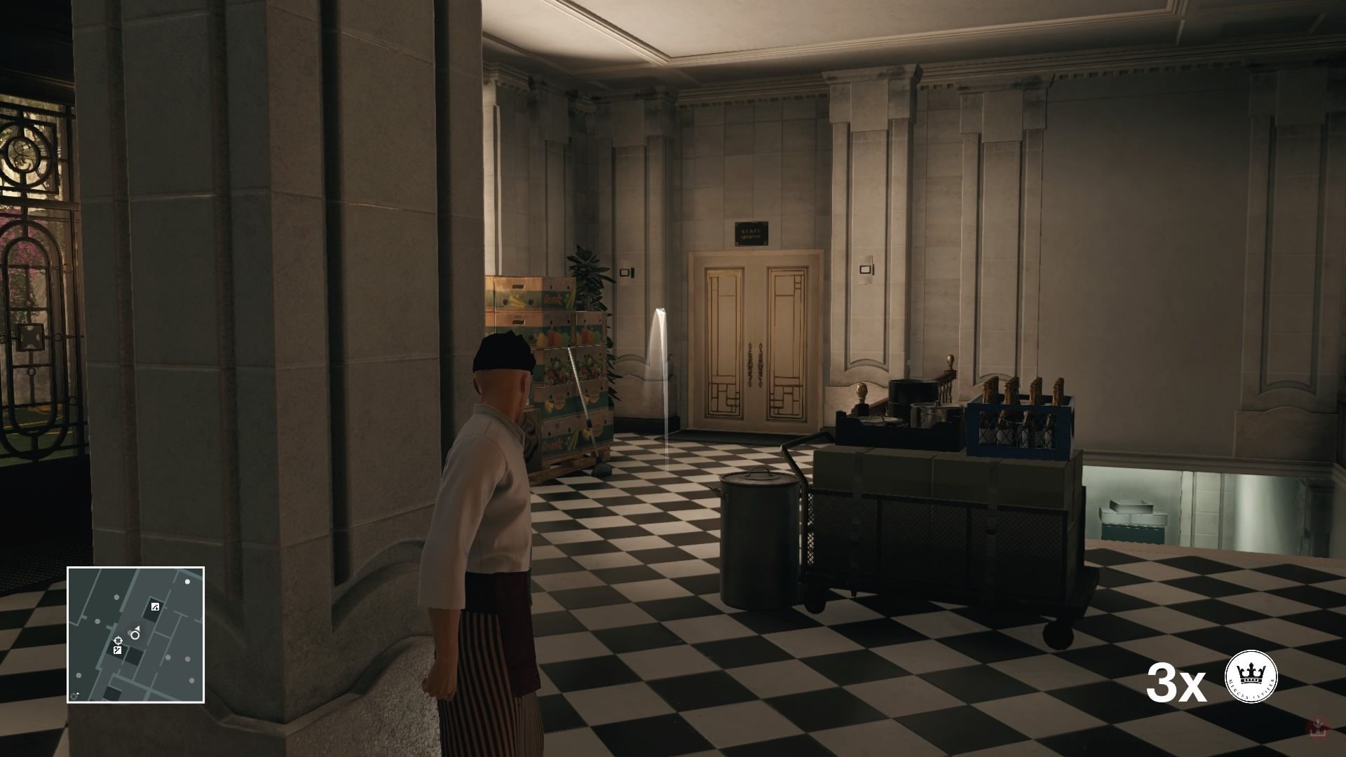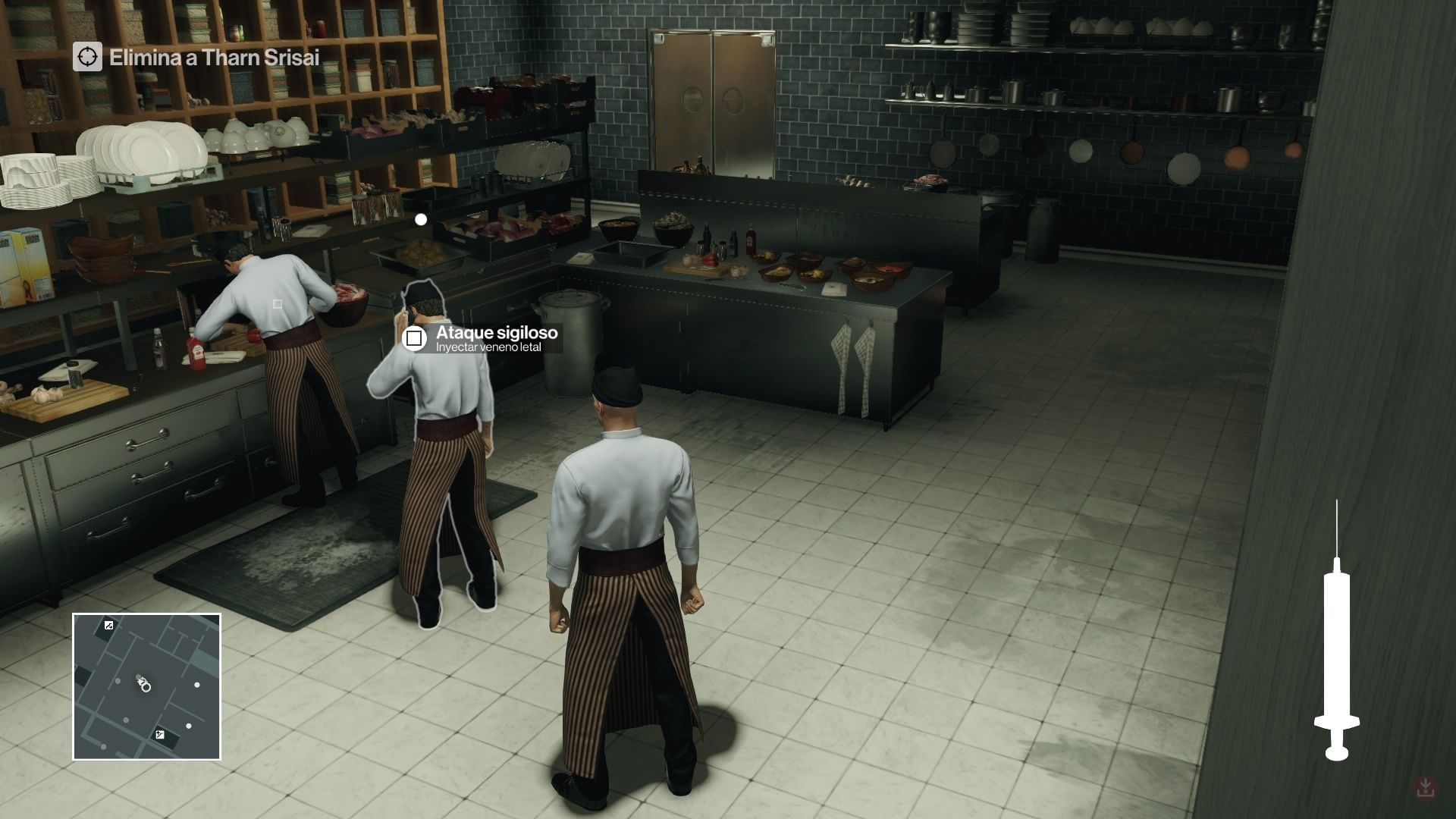 Acaba con Tharn con la jeringuilla y sal de la cocina por la puerta trasera. En el siguiente pasillo verás a Naruemon hablando con otro hombre. Crea una distracción al fondo de la sala para llamar la atención del hombre y matar silenciosamente a Naruemon.