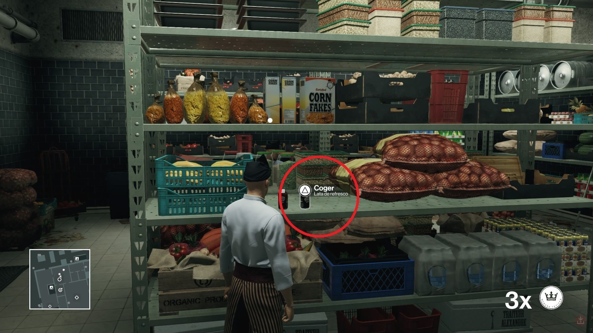 Empieza primero por Naruemon tal y como hiciste en el nivel anterior. Deja su cuerpo escondido en las escaleras que bajan y oculta también el del otro hombre. Entra por la puerta del fondo, la que está a la izquierda de las escaleras que bajan, y ve por la siguiente puerta hasta otra parte de la cocina. Aquí hay dos cocineros. Noquéalos rápidamente con las dos latas de refresco que hay en una de las estanterías.