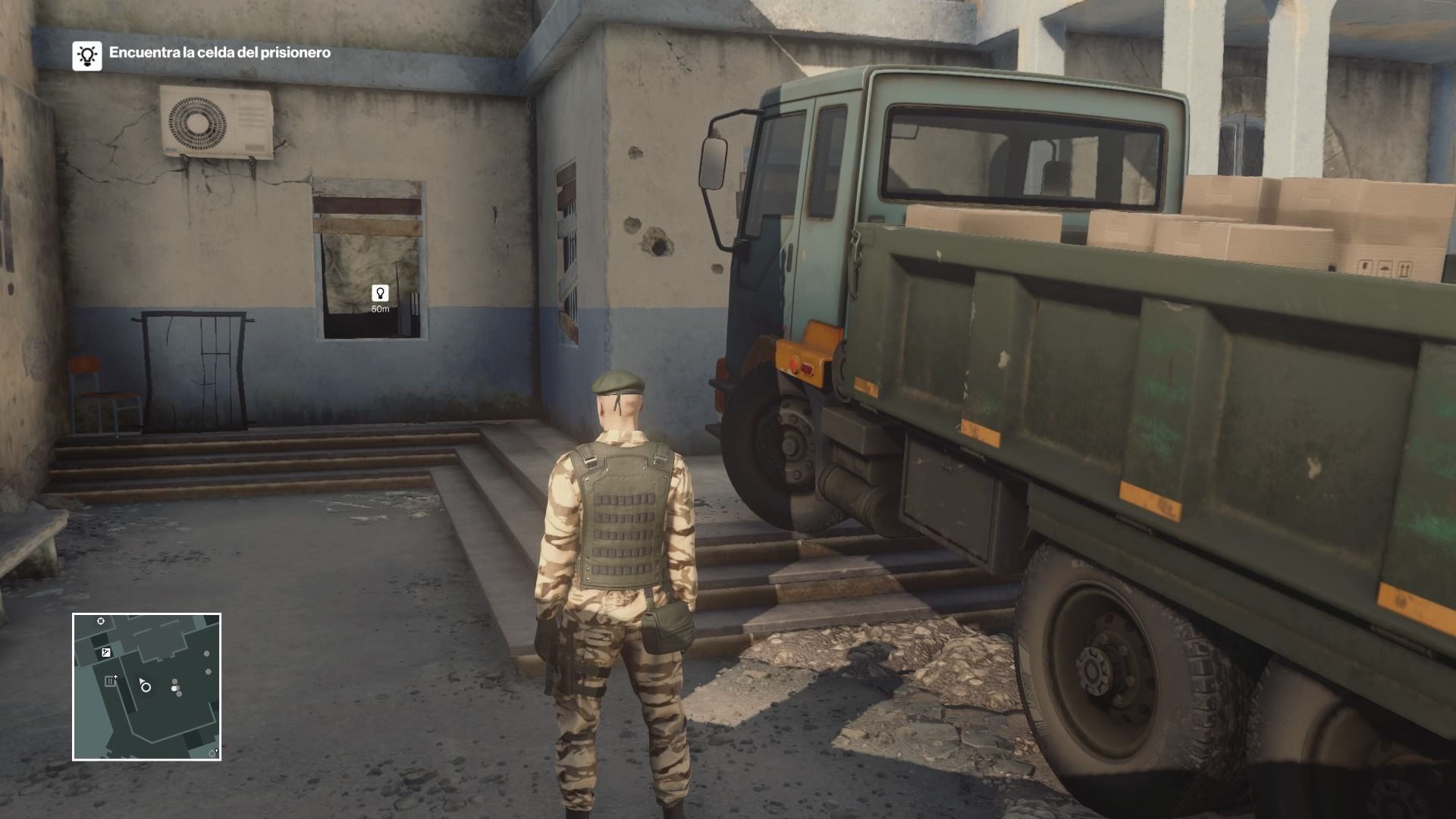 Pasa agachado sin hacer ruido por detrás del militar que ahora está fumando y sigue recto hasta donde se ha dirigido el otro. Noquéalo cuando esté mirando por el agujero y ponte su uniforme. Baja por el agujero y evita que el oficial de la plaza te vea. Entra por la ventana que queda a la izquierda de la entrada.