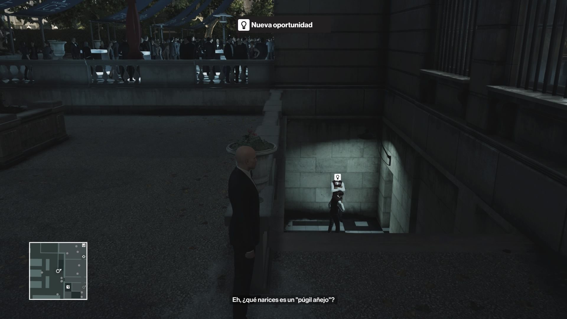 Accede al interior del edificio y verás aparecer a Viktor Novikov bajo un foco de luz. Este es el primer objetivo. Avanza hasta la pasarela y después desvíate hacia el bar. Crúzalo, sal por la terraza y sigue por los jardines hasta dar con unas escaleras que bajan a la bodega. Ahí verás a dos camareros. Espera a que acaben de hablar y acepta esa oportunidad para acabar con el objetivo.