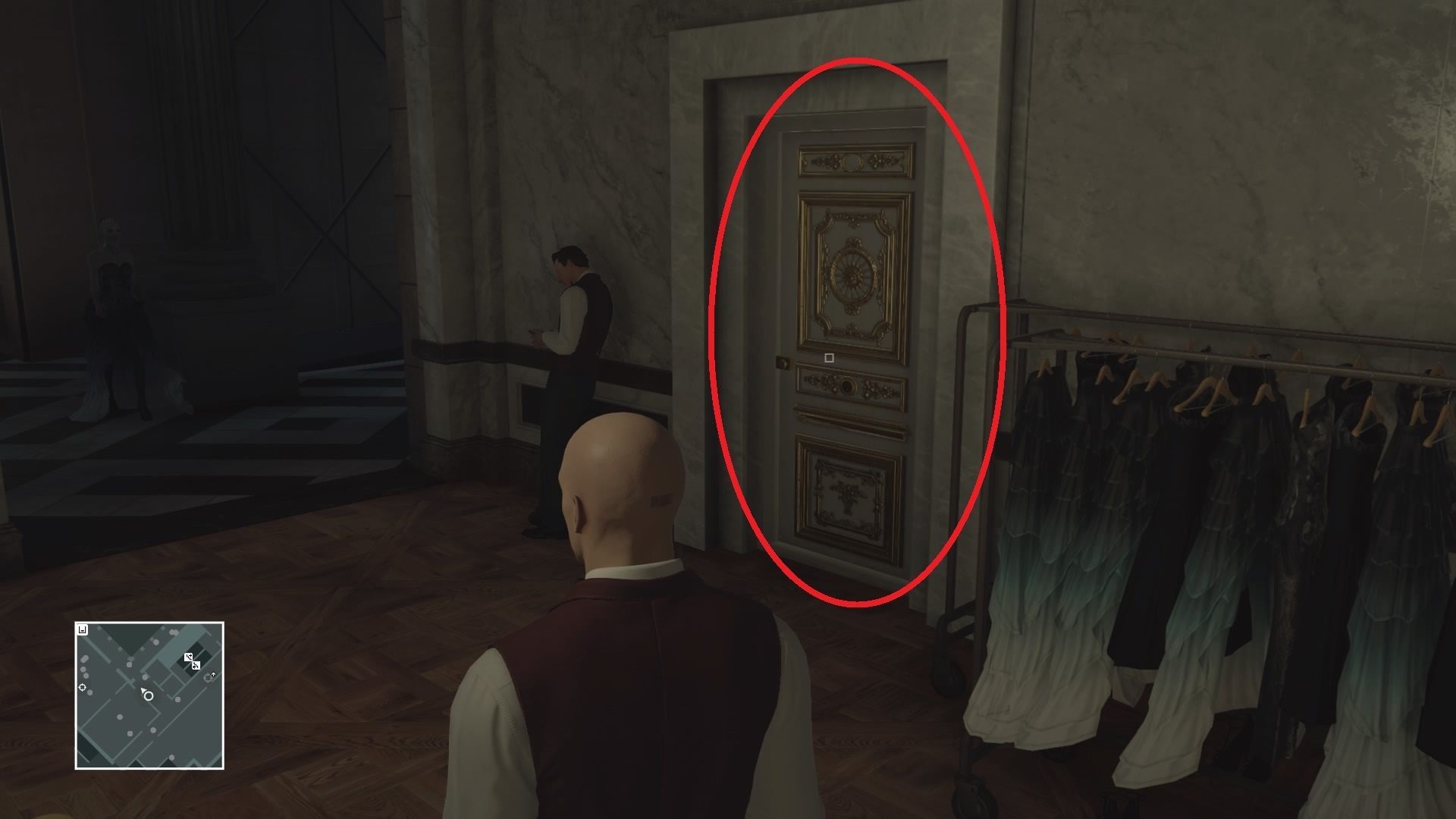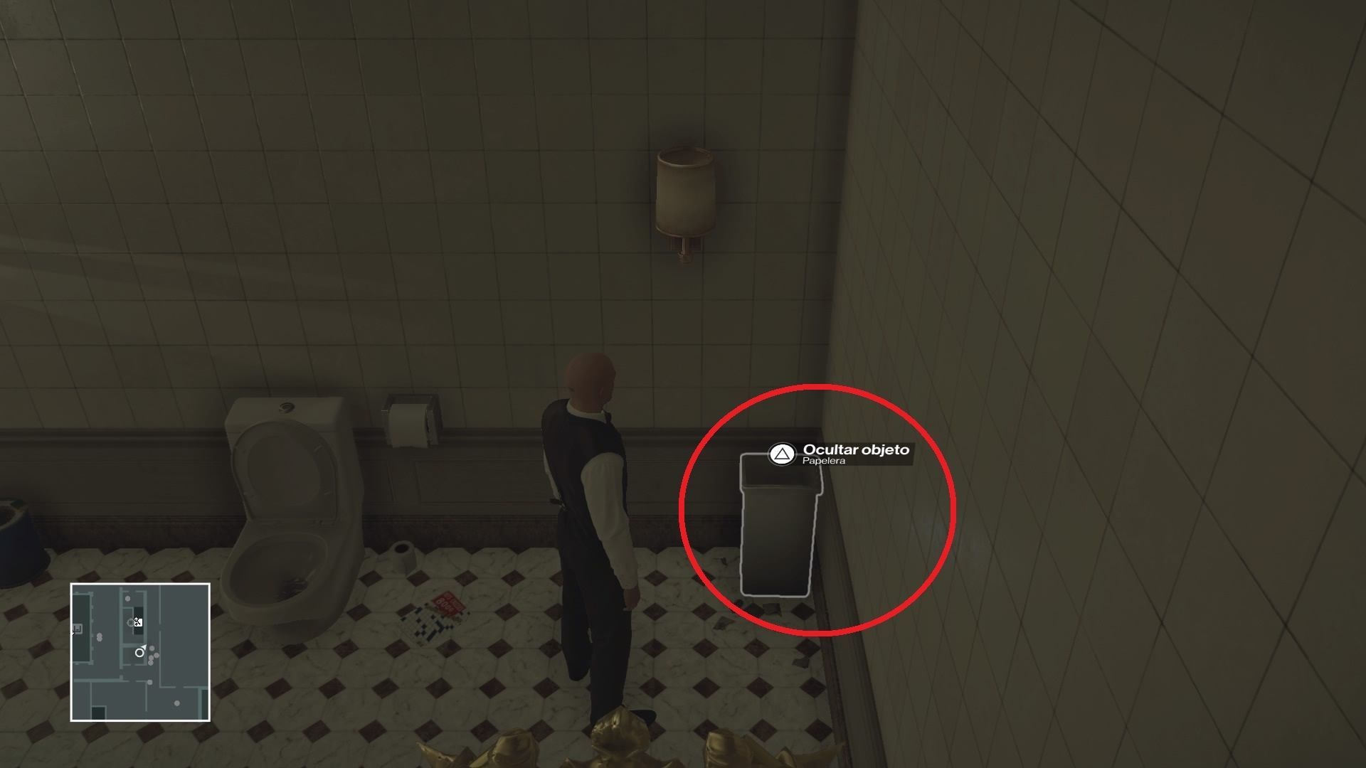 Con esta nueva apariencia puedes acceder al piso superior del palacio. Una vez arriba, entra en una gran sala con mesas rectangulares en las que solo hay un único camarero con una tablet en las manos. Cierra todas las puertas de la sala y acaba con el camarero. Disfrázate con su ropa y esconde el cuerpo en el armario que hay cerca de la terraza. A continuación dirígete a uno de los baños de esta planta y esconde tu arma en la papelera.