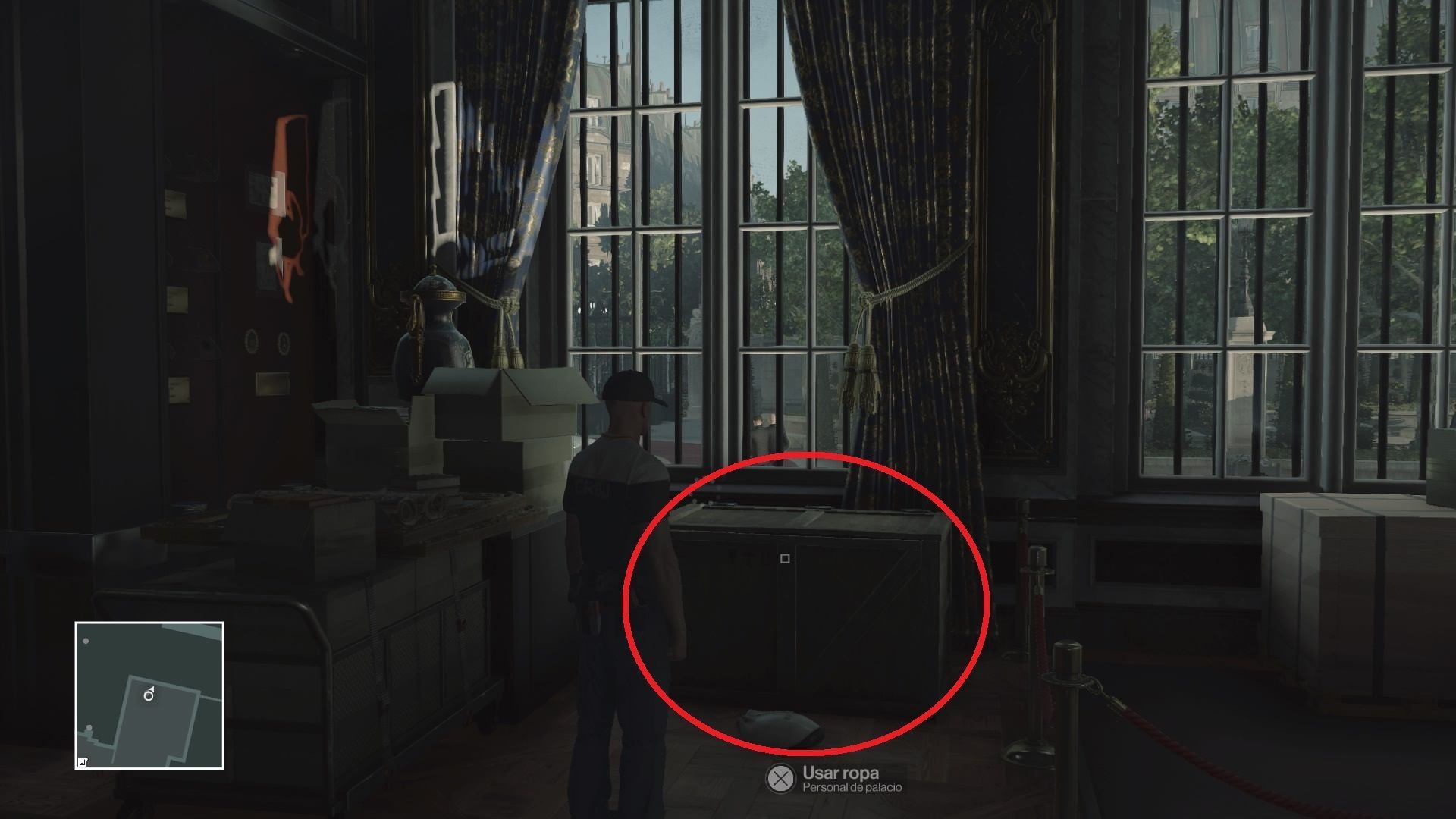 Vuelve a la entrada principal, ponte de espaldas a la salida y entra por cualquiera de las puertas que quedan a la izquierda. Estarás en una zona oscura con cuadros y otros objetos de arte. Acaba con el único trabajador que hay aquí y disfrázate con la ropa de personal técnico. Asegúrate de que escondes el cuerpo dentro de la caja que hay al final de esta sala.