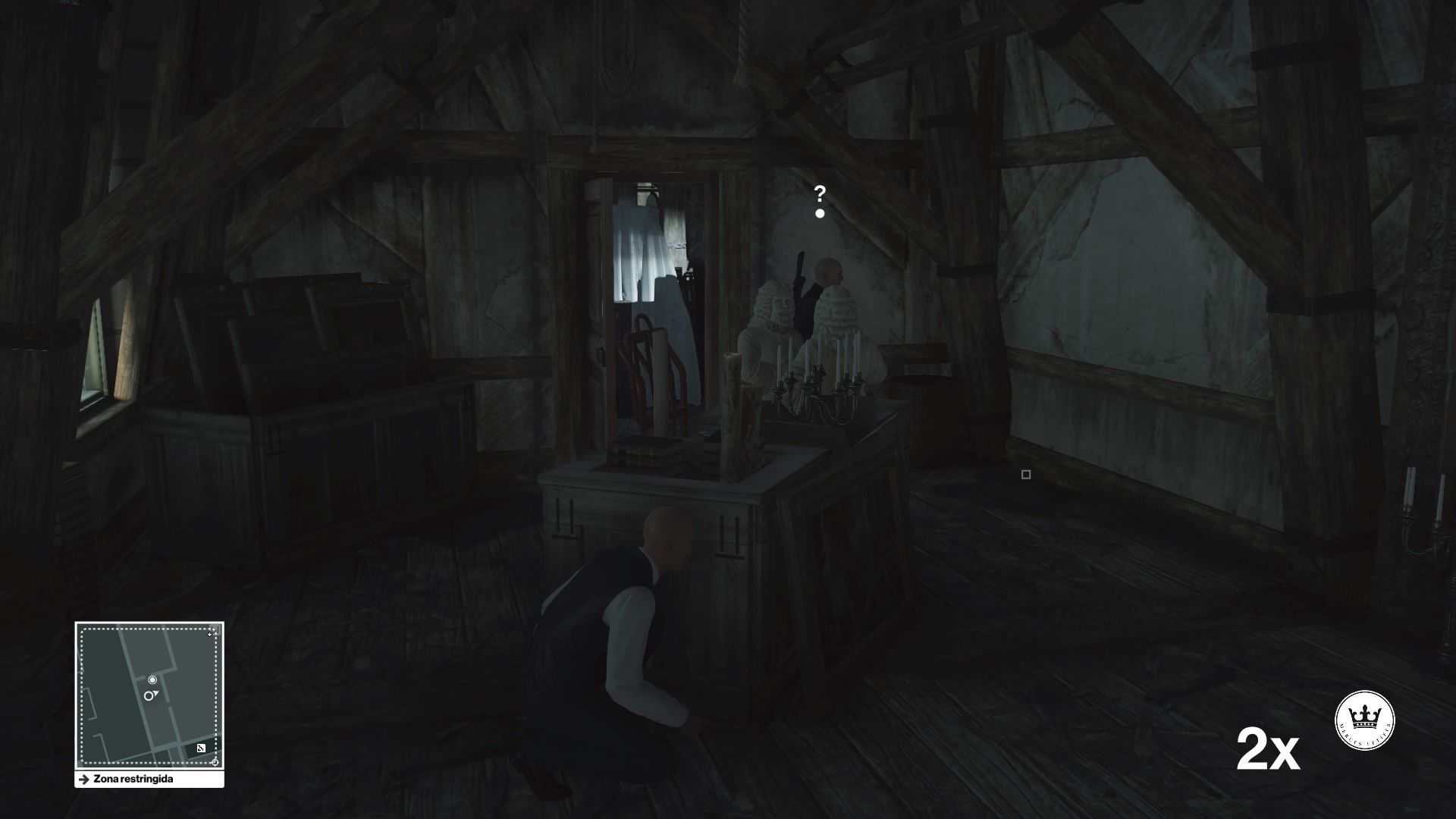 Regresa al interior del edificio y encuentra el acceso a las buhardillas, cerca de unas escaleras que llevan al piso inferior. En esta zona muévete con cuidado y acaba con cualquiera de los guardaespaldas llamando su atención con las monedas. Esconde el cuerpo en una de las cajas y disfrázate con su ropa.