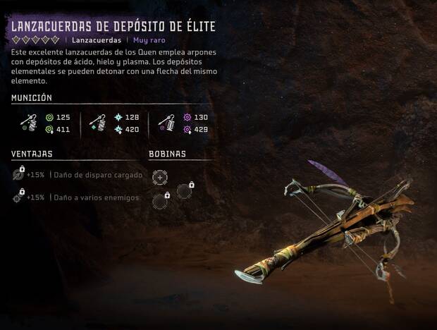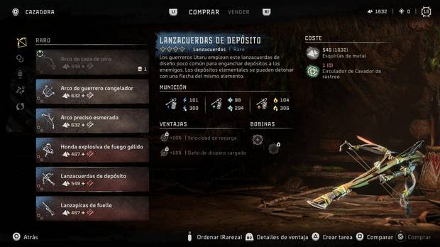 Horizon Forbidden West nos presenta un arsenal amplio y variado para que Aloy pueda superar cualquier desafío. Cada grupo o clase de arma se divide por categorías de rareza, yendo desde las más básicas (las poco comunes de color verde) hasta las más especiales (las legendarias, de color anaranjado). Obviamente, cuanto más rara sea un arma mejores serán sus estadísticas y más poderosas y útiles nos resultarán.