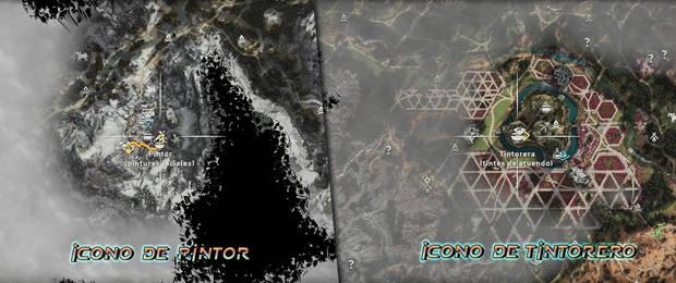 Estos comerciantes especiales se pueden encontrar en los principales asentamientos del mapa, como por ejemplo en Cantollano, Lanzahirviente, El Baluarte o Marjalespina. El icono de los pintores tiene la forma de un palo, mientras que el de los tintoreros es la forma de un cuenco.