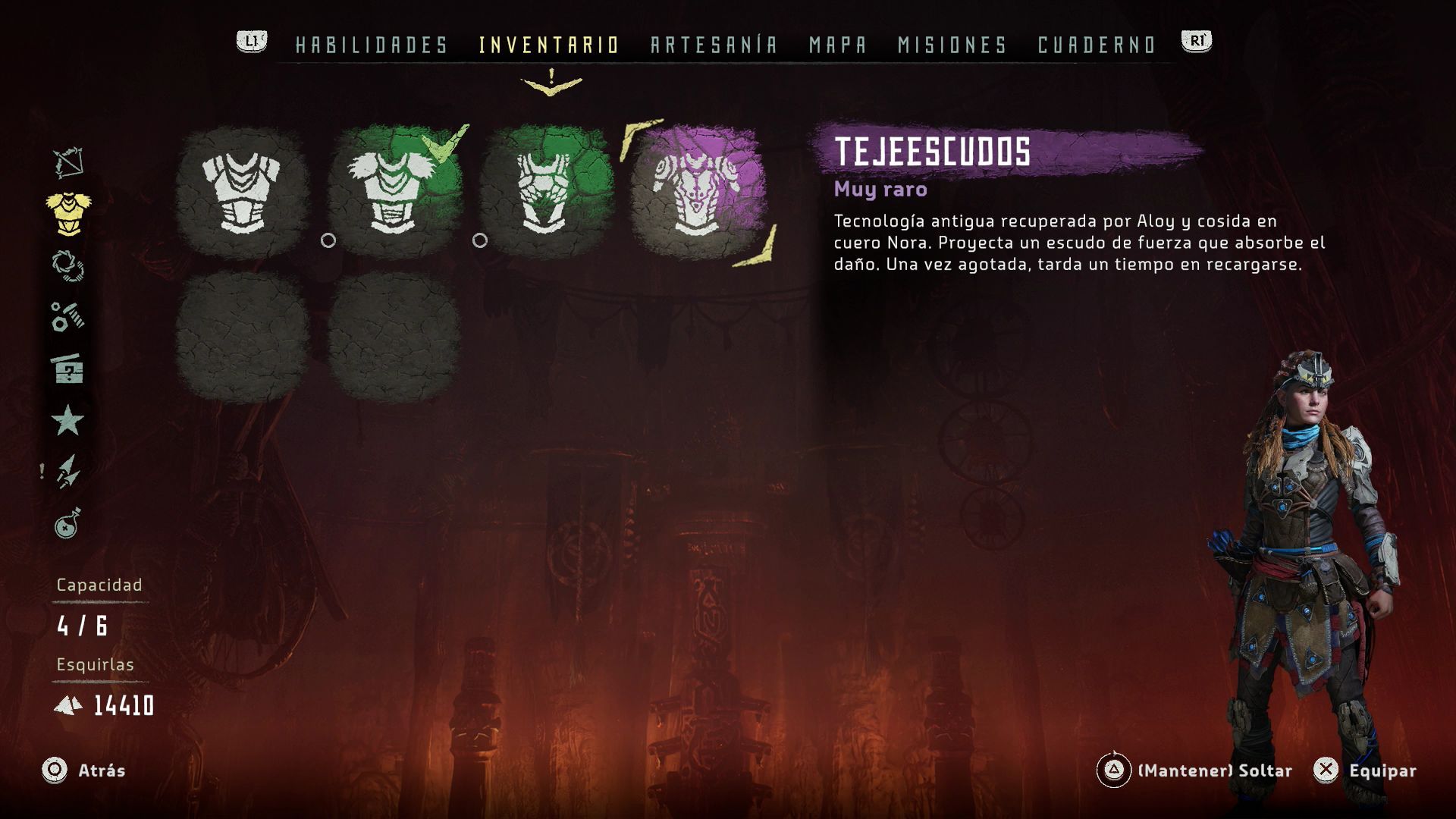 El atuendo Tejeescudo es la mejor armadura del juego. No tiene huecos en los que introducir modificaciones pero tiene una habilidad única que crea un escudo que absorbe cierta cantidad de daño antes de desaparecer. Cuando el escudo desaparece solo tendrás que esperar un poco para que se recargue.