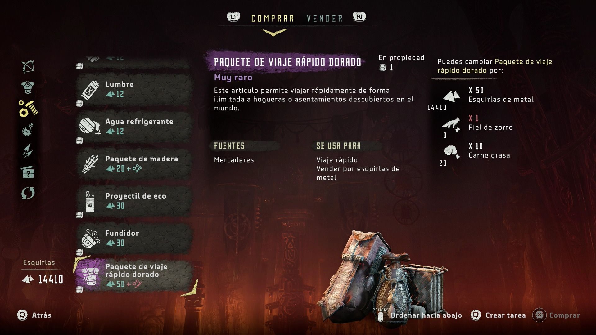 Una vez que tengas estos objetos habla con cualquier mercader que venda artículos de caza y entra en el apartado Recursos. Al final de la lista de objetos que tiene en venta verás el Paquete de viaje rápido dorado.