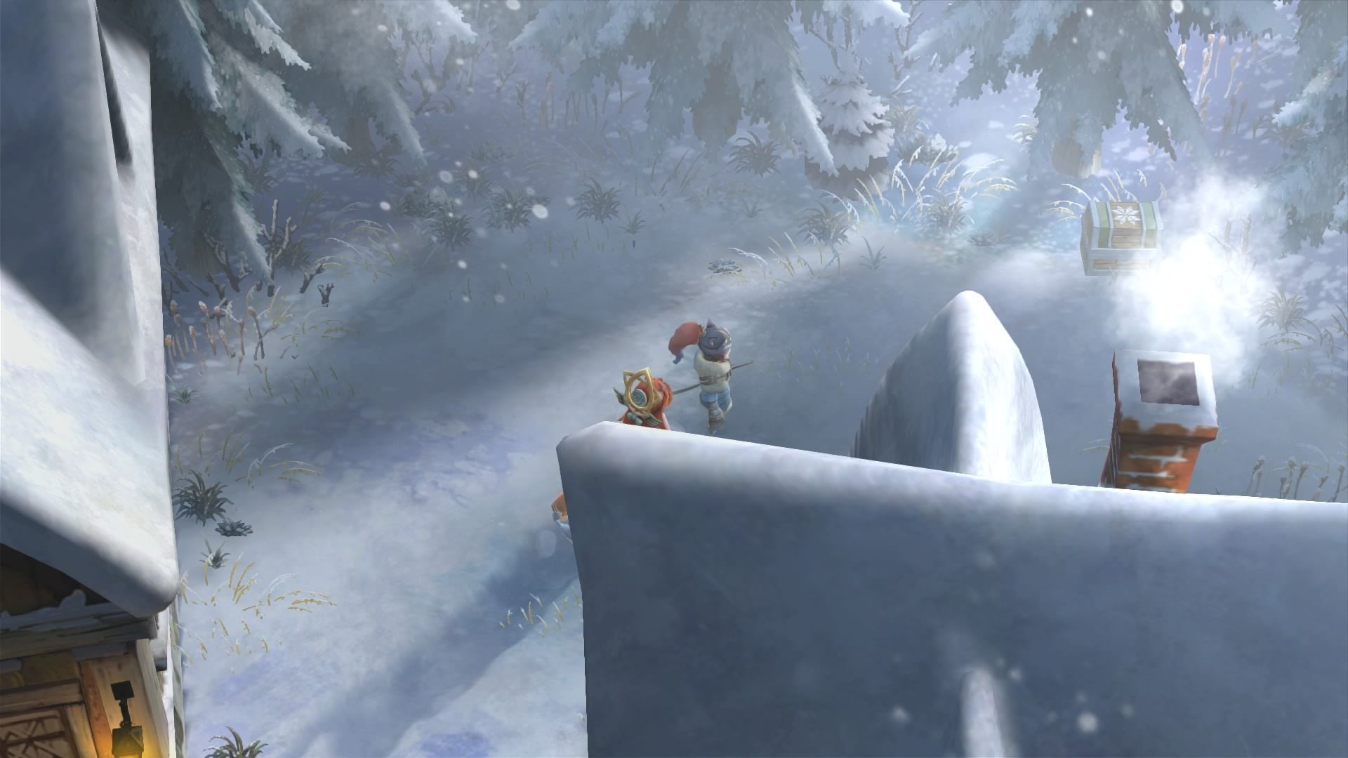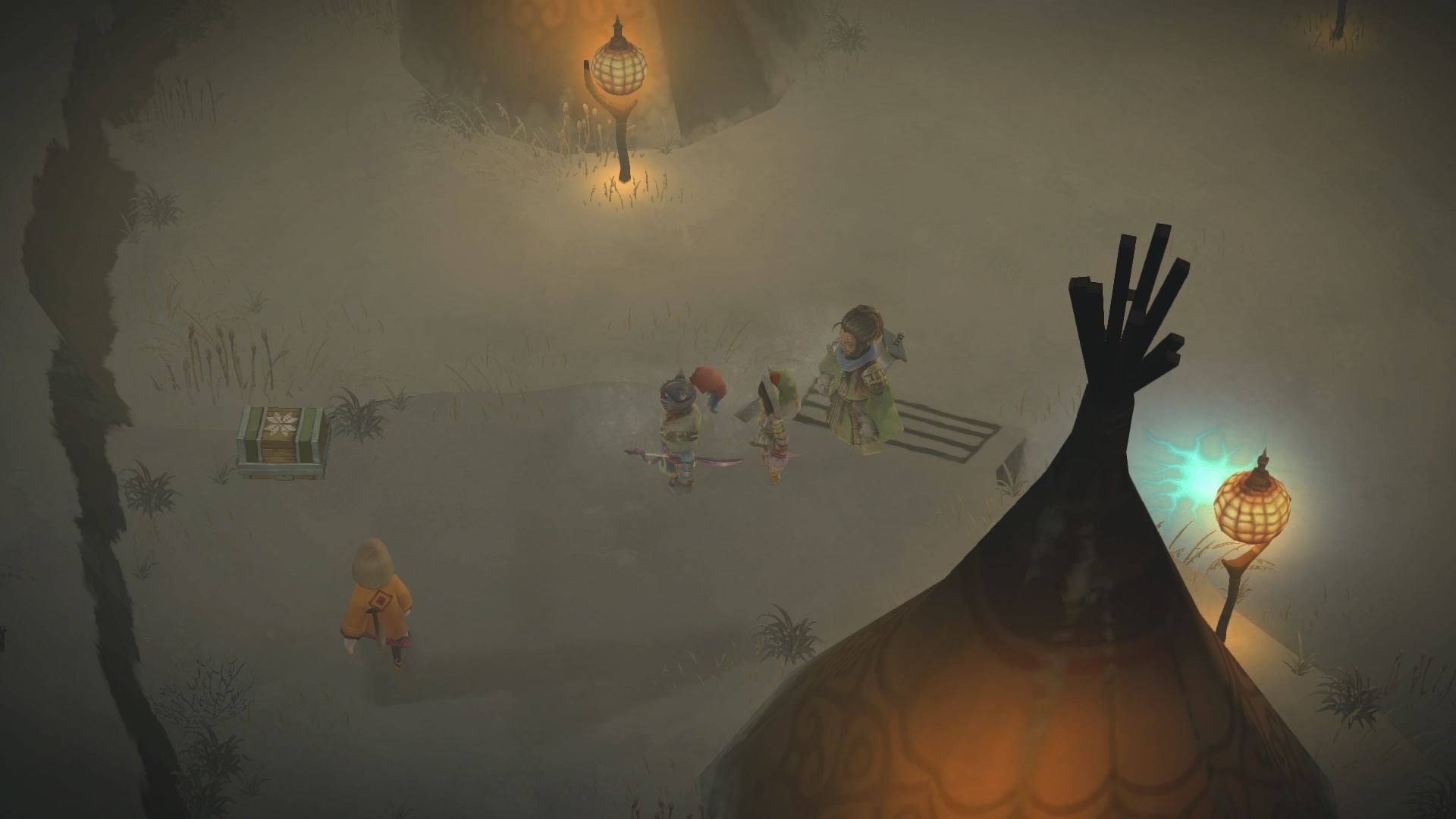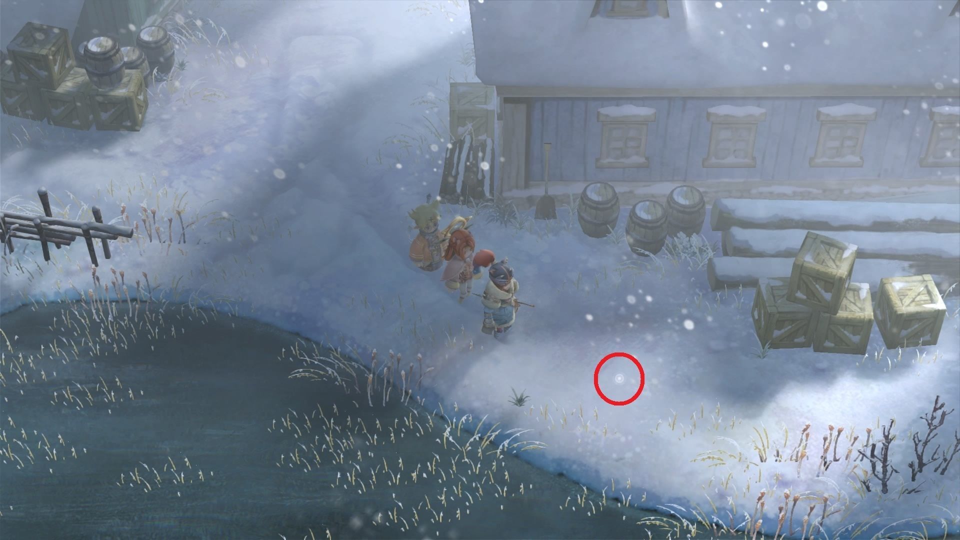 En la casa de la izquierda tienes a los comerciantes y al chef. Al hablar con Kind-Looking Lady podrás darle unos ingredientes (Snowbell Mushroom, Sunset Citron, Icicle Kelp y Lampwort) para obtener Snowbell Mushroom Stew y Mellow Stew Recipe.