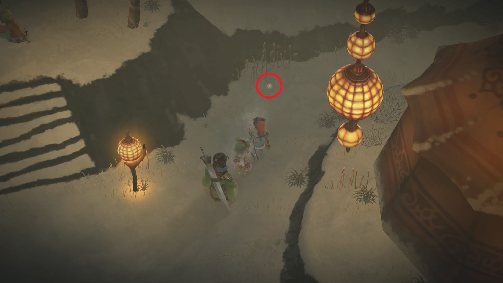Rodea la gran tienda de campaña central. La siguiente pequeña que verás es donde están todos los comerciantes y el chef. Un poco más al sur verás un shining spot.