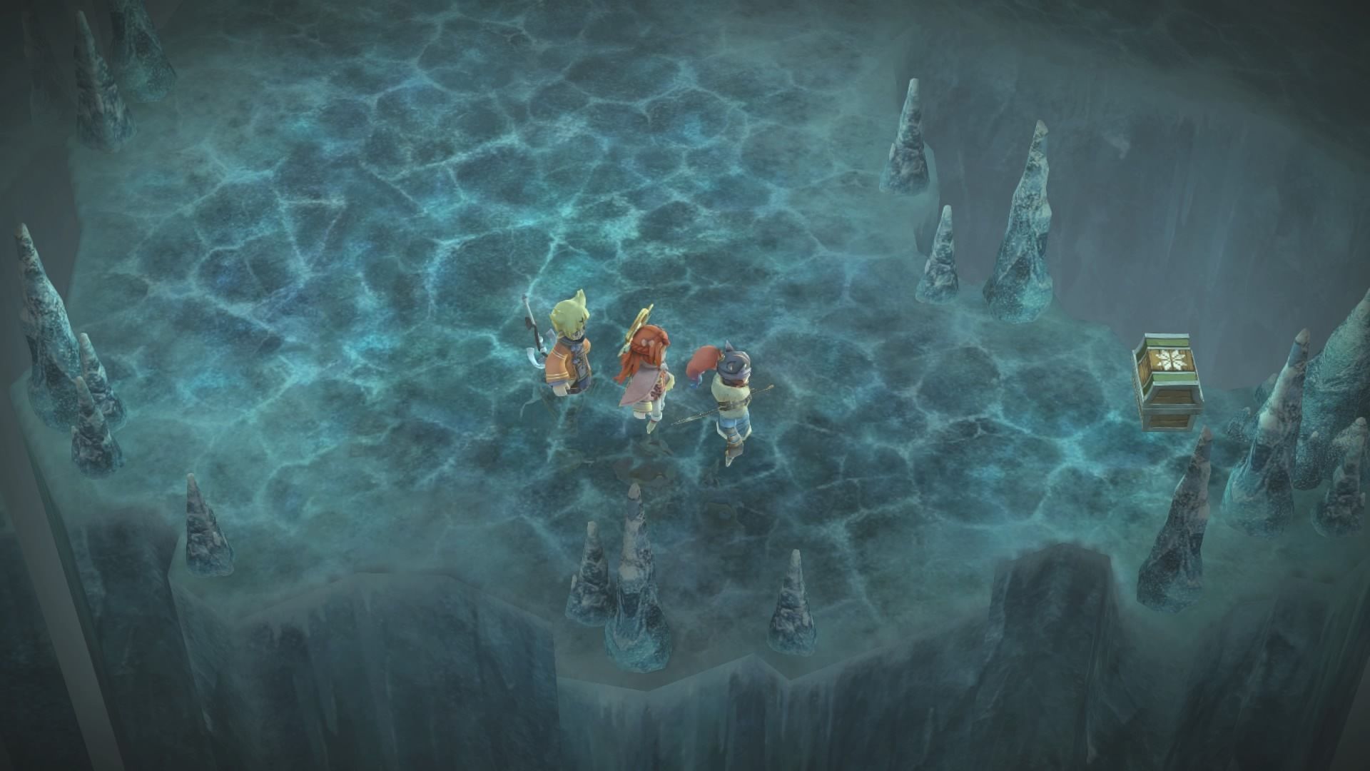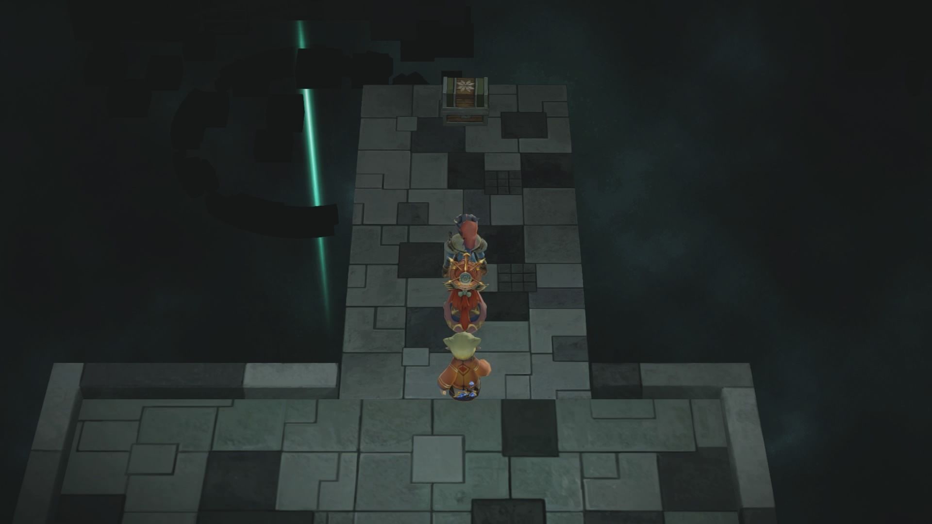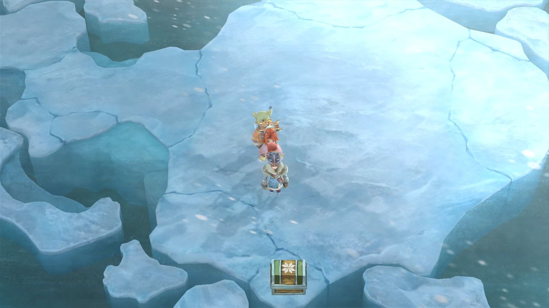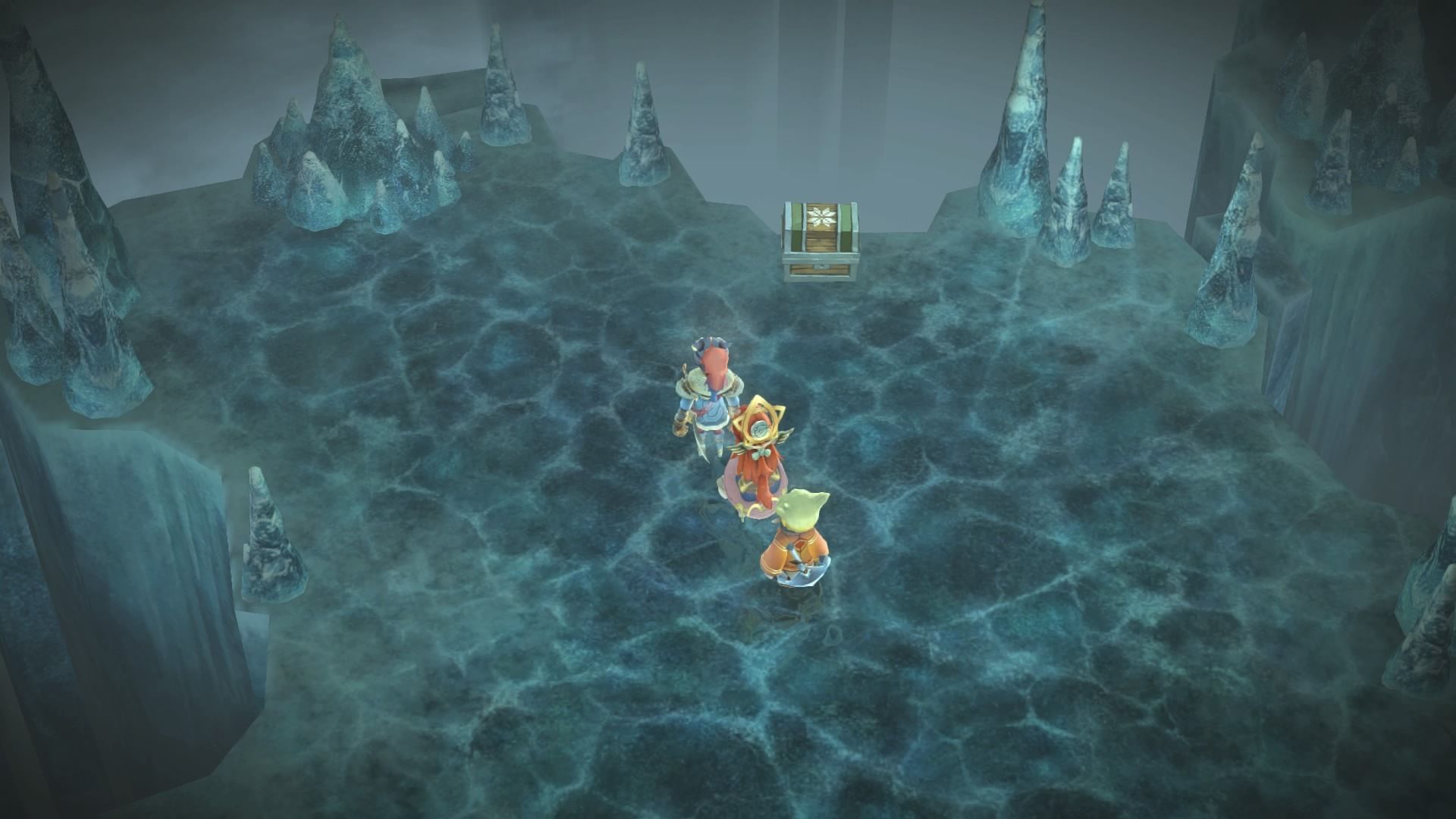 Baja las escaleras, vence a los monstruos y activa el interruptor de la izquierda. Da media vuelta para cruzar por el puente que has formado. Derrota a los enemigos y pulsa el interruptor al sur. Sigue por la izquierda, baja las escaleras y activa también este. Ve arriba, por la izquierda, para coger un cofre (Blue Frost).