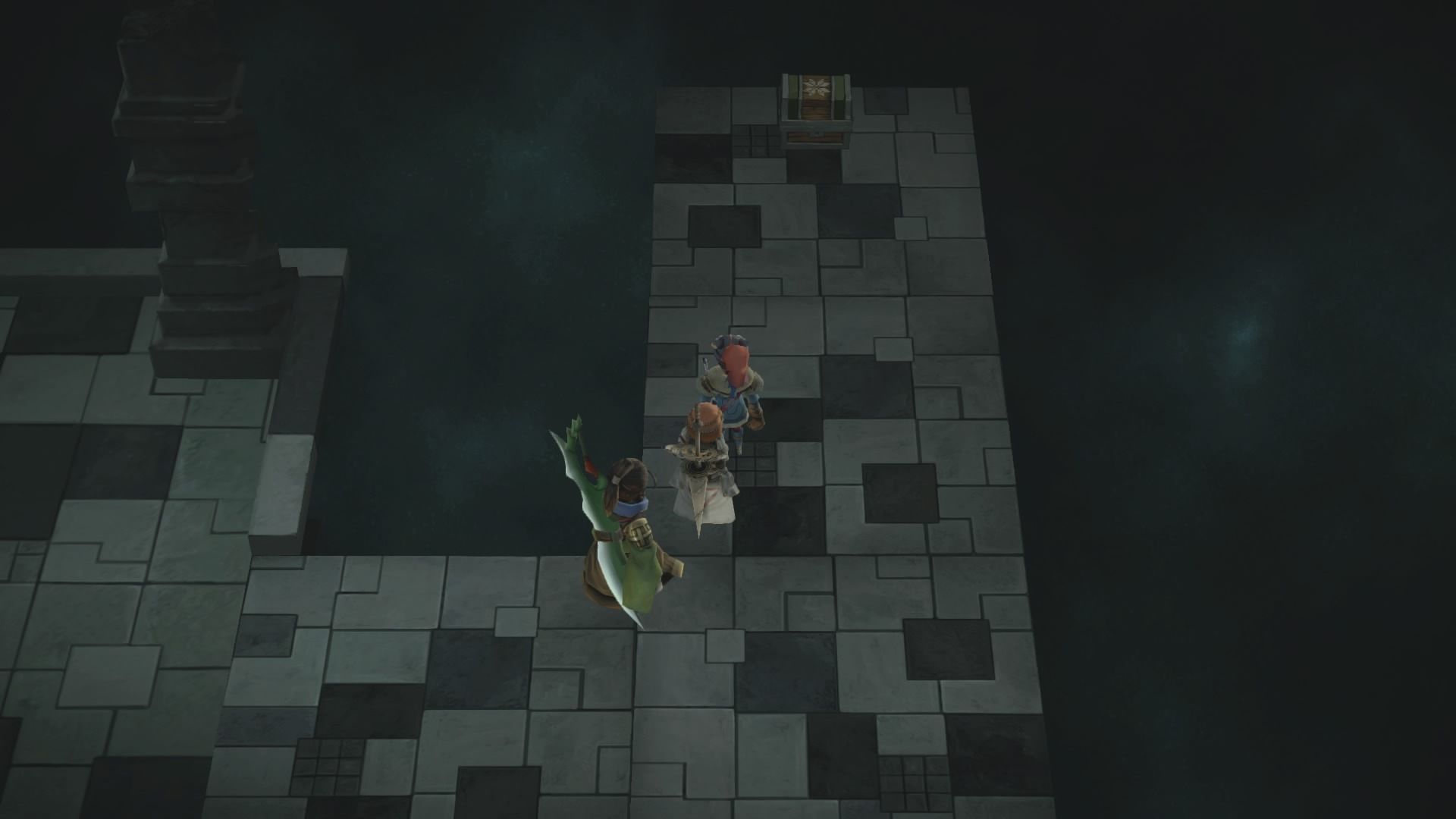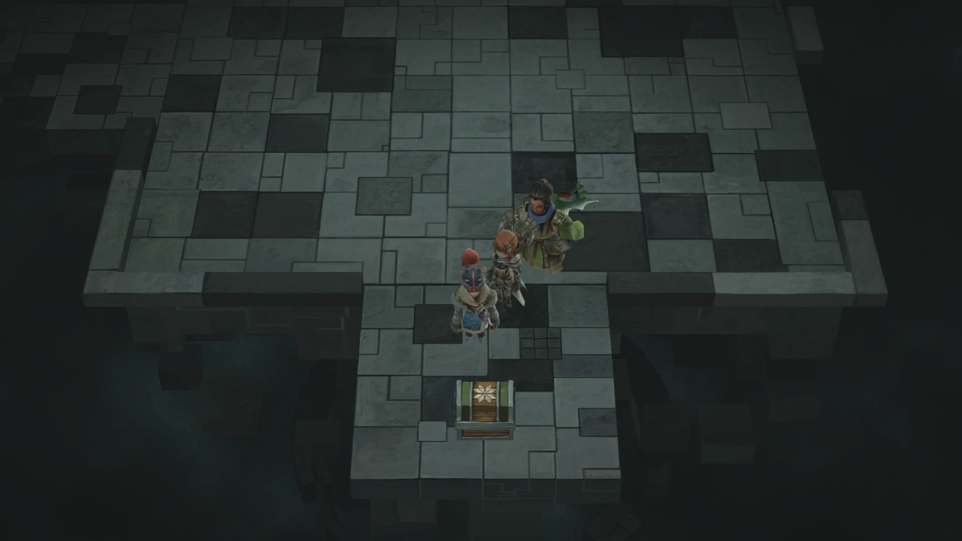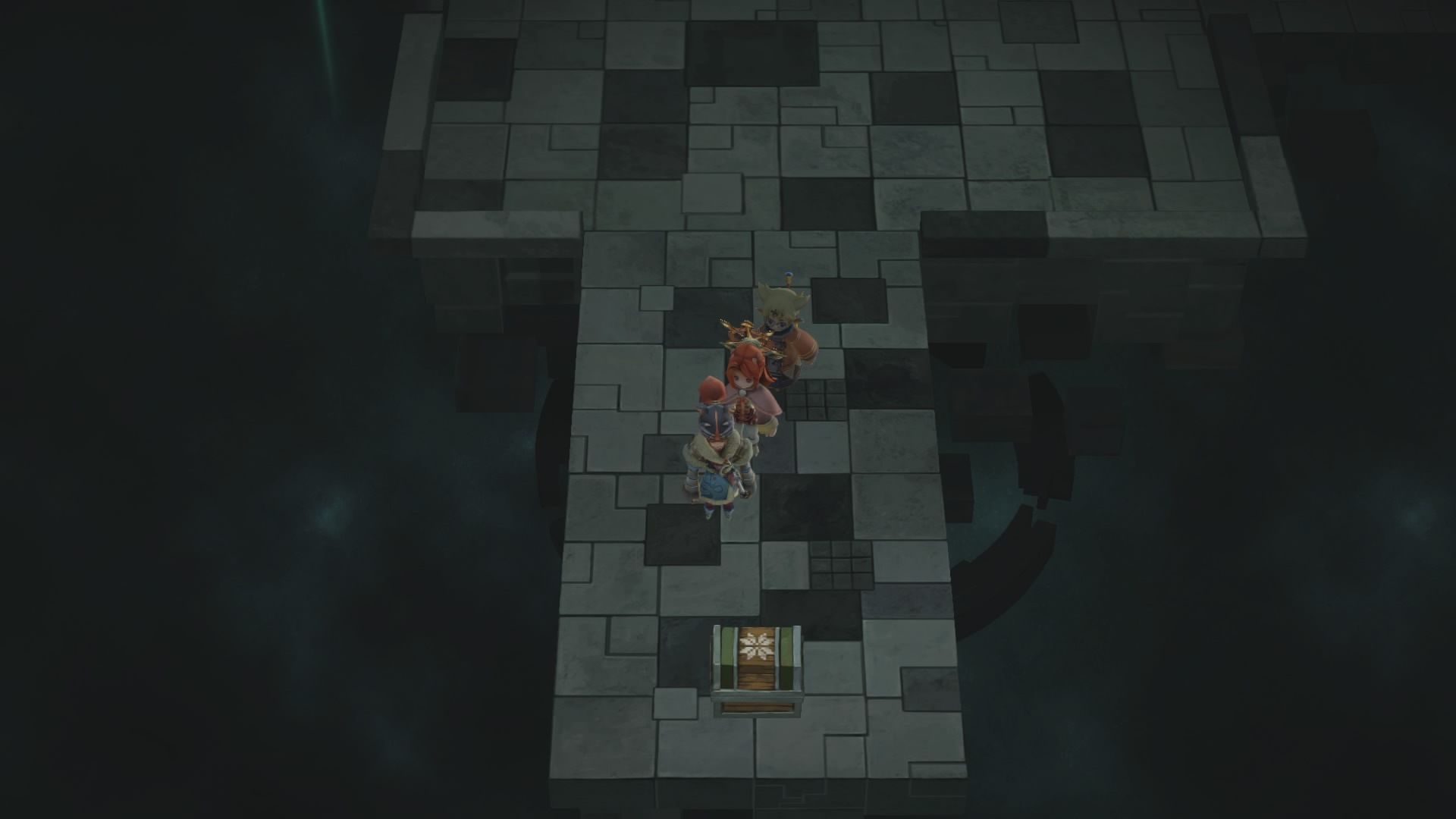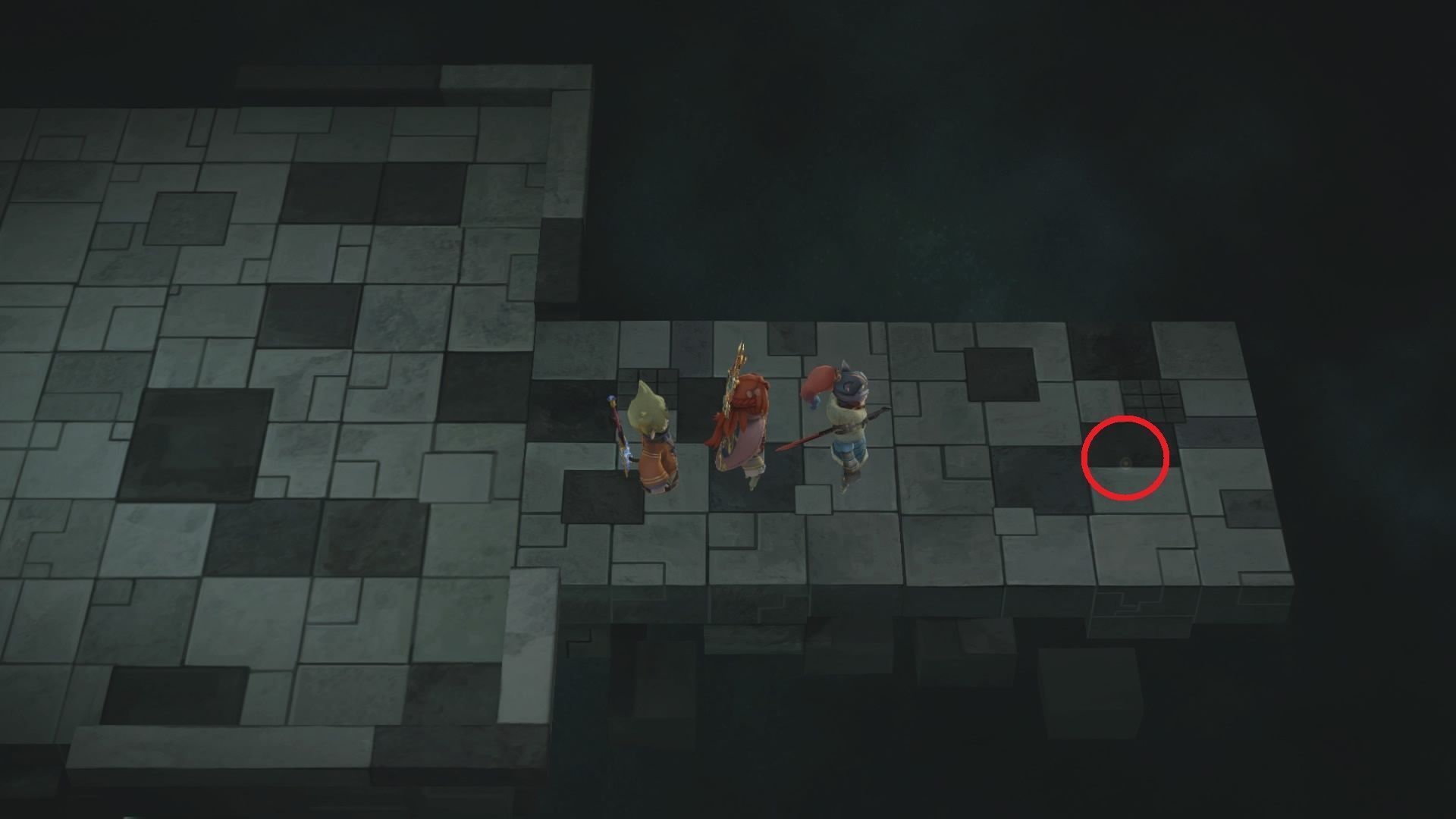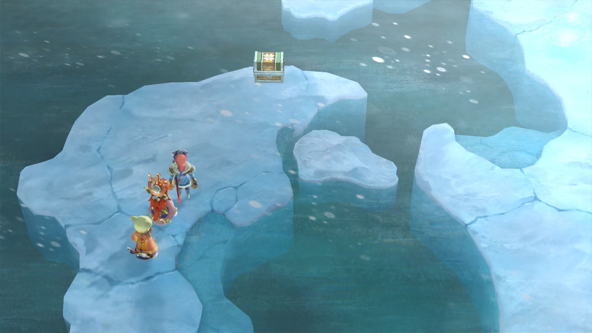 Baja las escaleras, vence a los monstruos y activa el interruptor de la izquierda. Da media vuelta para cruzar por el puente que has formado. Derrota a los enemigos y pulsa el interruptor al sur. Sigue por la izquierda, baja las escaleras y activa también este. Ve arriba, por la izquierda, para coger un cofre (Blue Frost).