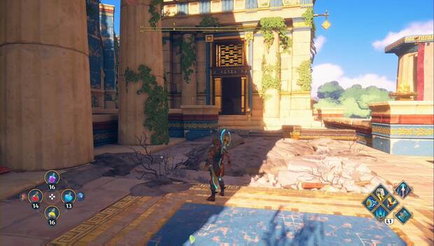 - Bola al noroeste: trepa la pendiente y entra por la puerta izquierda. Activa la palanca para retirar la barrera, coge la caja de metal, ponla en la placa pesada, haz aparecer un Clon de Heósforo y, con Fenyx sobre la placa, ya puedes tirar de la bola sin más.