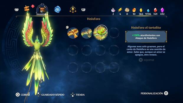 Desbloquearás a Heósforo al completar la misión principal Un rayo de tristeza. A partir de ese momento, Heósforo forma parte de tu equipación, podrás verlo en la parte izquierda del menú, y puedes usar sus habilidades en combate. Además, cada Heósforo cuenta con sus propias perks exclusivas, así que escoge bien cuál quieres usar.