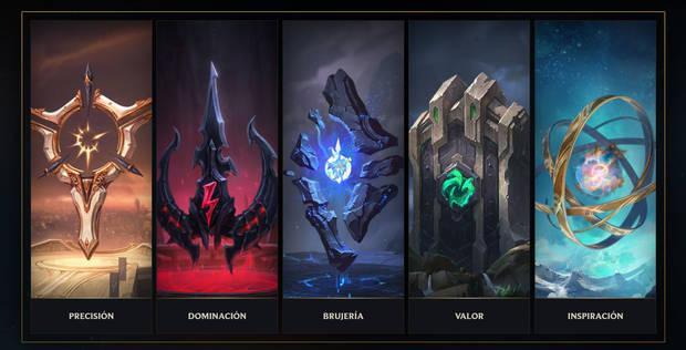 - En total hay 5 ramas de runas: Precisión, Dominación, Bujería, Valor e Inspiración, y cada una de ellas está enfocada a mejorar un rol o posición preferente en la partida.