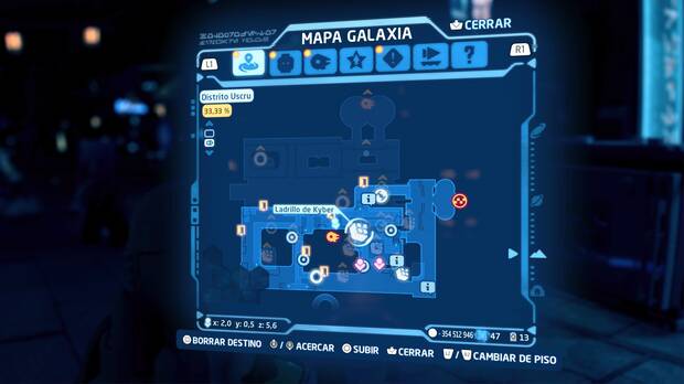 - Para conseguirlo tienes que insertar tres tarjetas en las máquinas que hay encima del tejado de una tienda. Si te fijas bien verás las tres tarjetas marcadas con un icono morado en la imagen del mapa superior (la tercera se vislumbra con menor opacidad porque está una planta por encima). El problema está en que para alcanzar el tejado necesitas dar un salto muy grande. Puedes hacerlo usando a un personaje como Jango Fett, aprovechando su mochila propulsada para llegar al tejado sin complicaciones saltando desde la plataforma central que hay en este mercado.
