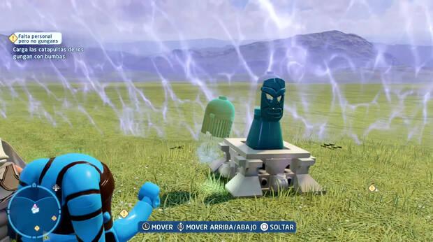- Cerca del anterior minikit verás una estructura donde hay una pared agrietada. Tienes que seleccionar a un personaje de clase Chatarrero y utilizar la herramienta del bláster para poder disparar a la pared y romperla (el bláster se consigue durante el Episodio VII).