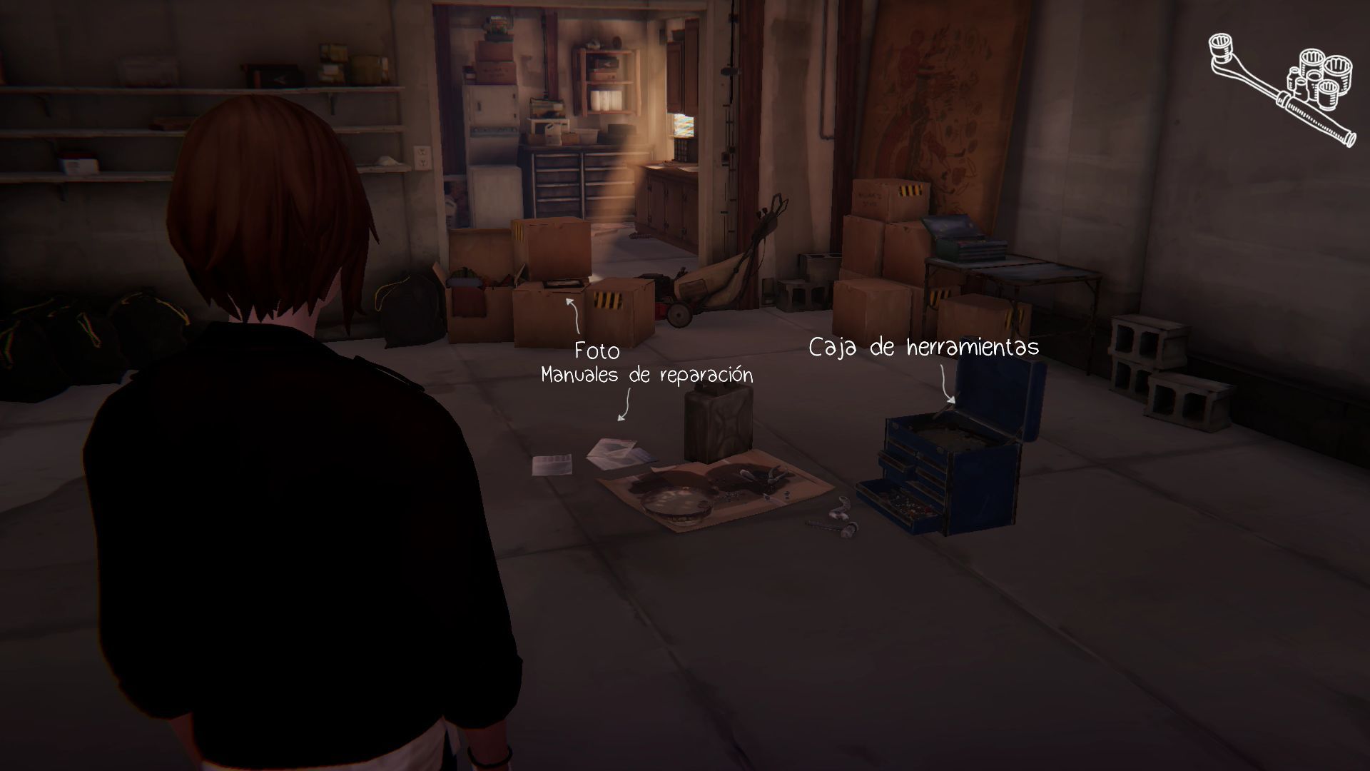 Avanza hasta que David te pida una llave de tubo. Abre su caja de herramientas que verás en el garaje para encontrarla y luego pinta en esa misma caja.