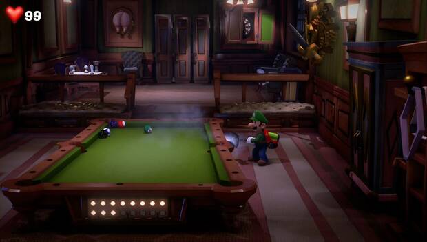 Ve a la sala del billar (te enseñarán que el ratón se ha colado por ahí), que ya conocemos de nuestra primera visita. Al avanzar te las verás con dos fantasmas dorados. Tendrás que buscarlos en las troneras de la mesa de billar o el armario para poder darles un fogonazo. Antes de nada, una cosa que se nos olvidó en nuestra primera visita. Coge una de las espadas del lado derecho y lánzala contra la diana.