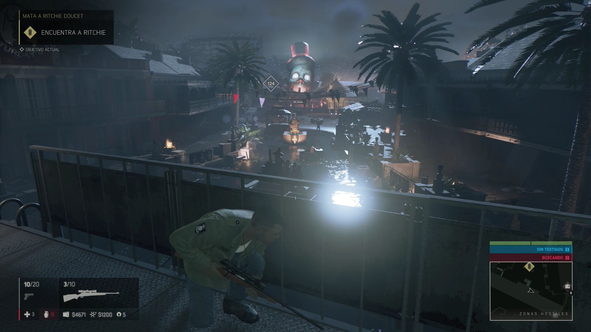 En esta zona verás un Rifle de francotirador que debes recoger y usar para acabar con los cinco enemigos que patrullan la zona inferior. Según vayas avanzando por el parque de atracciones irán apareciendo más enemigos por lo tanto avanza con cuidado. Los últimos tres de la primera zona aparecerán por la boca del payaso que ves al fondo.