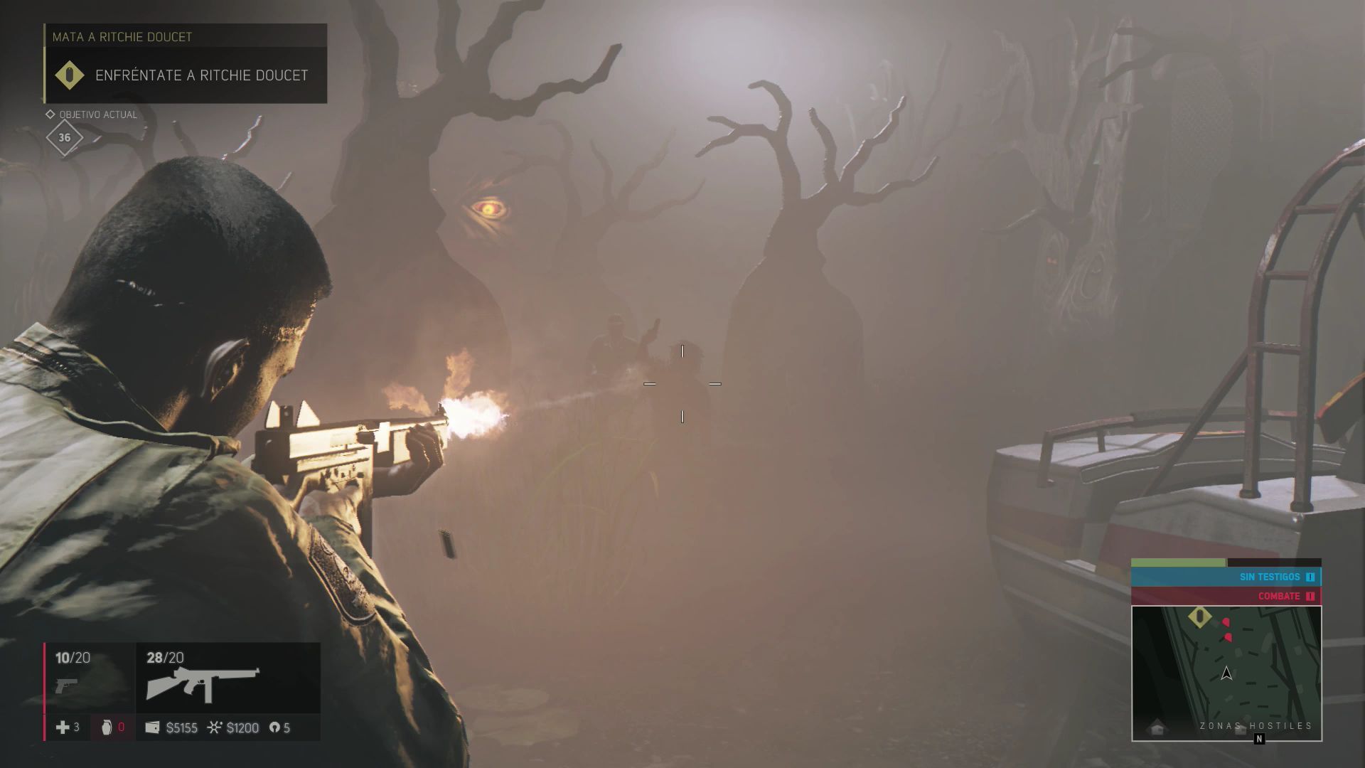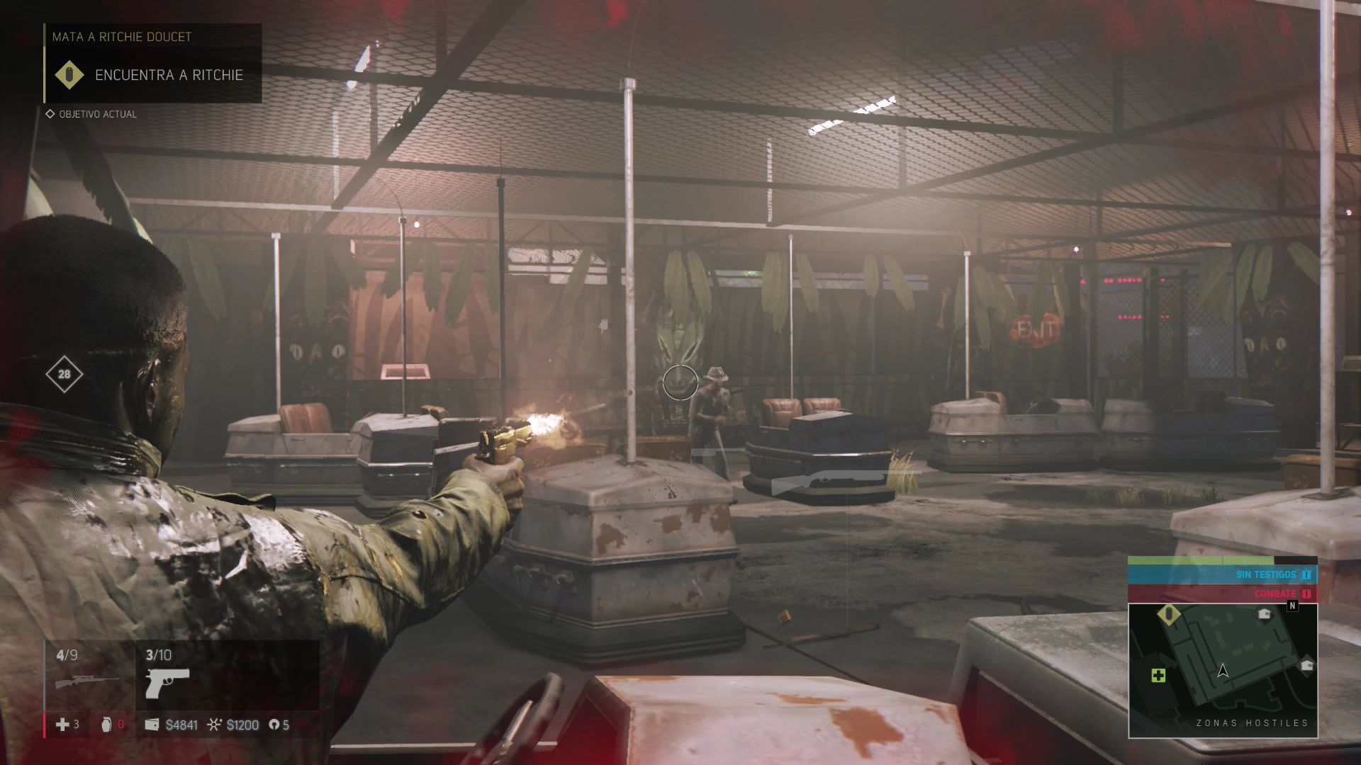 Dentro de la casa del terror serás emboscado por varios grupos de guardias. Sigue avanzando hasta llegar al final y sube las escaleras para llegar al despacho en el que está Ritchie. Al abrir la puerta acaba primero con el guardia de la derecha y luego dispara algunas veces al objetivo principal para que caiga herido al suelo y acércate para acabar su vida.