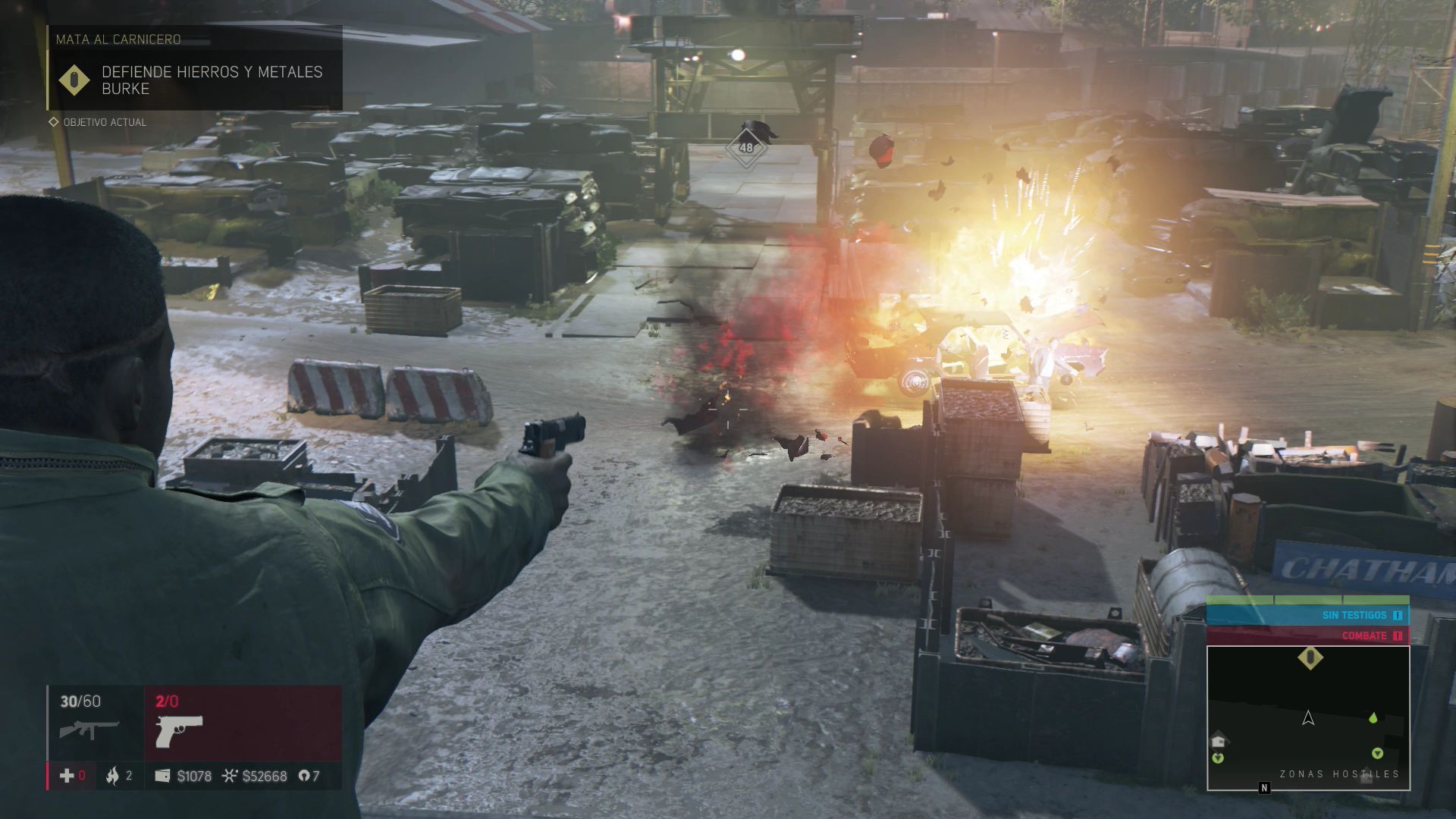 Al llegar al desguace tendrás una escena y tras ella comenzará un asalto al desguace. Equípate el rifle francotirador que ves en la zona y acaba con todos los enemigos que vayan apareciendo en la zona.