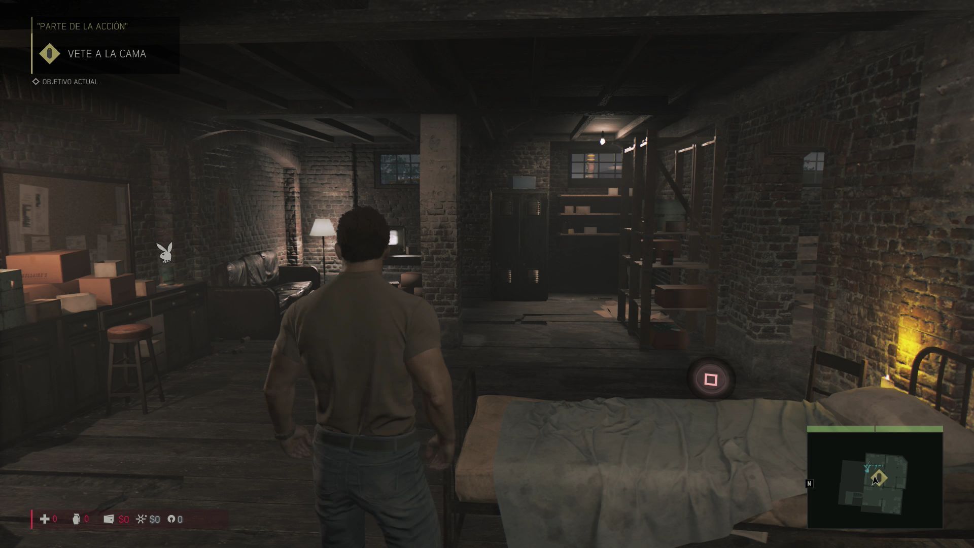 Cuando acabe la escena baja al sótano y antes de tumbarte en la cama para dormir eres libre de recoger los coleccionables que ves en la zona.