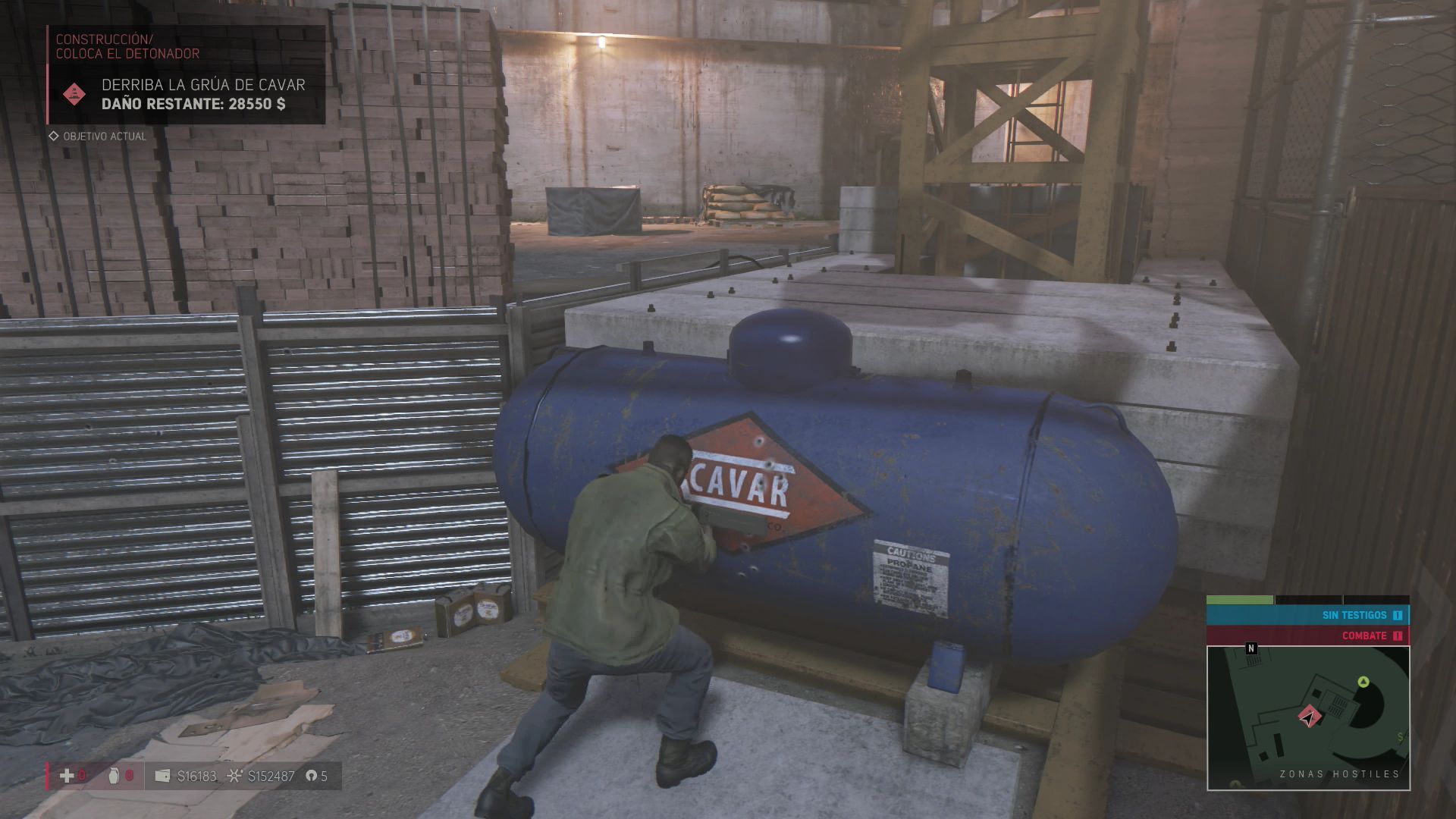 Activa el objetivo de derribar la grúa de Cavar. Ve hasta el punto que te indican y acaba con todos los enemigos, cuando ya no quede nadie baja a la parte inferior y examina un tanque de gasolina de color azul para colocar un explosivo. Cuando salgas de la zona tendrás una escena en la que verás cómo se destruye la grúa.