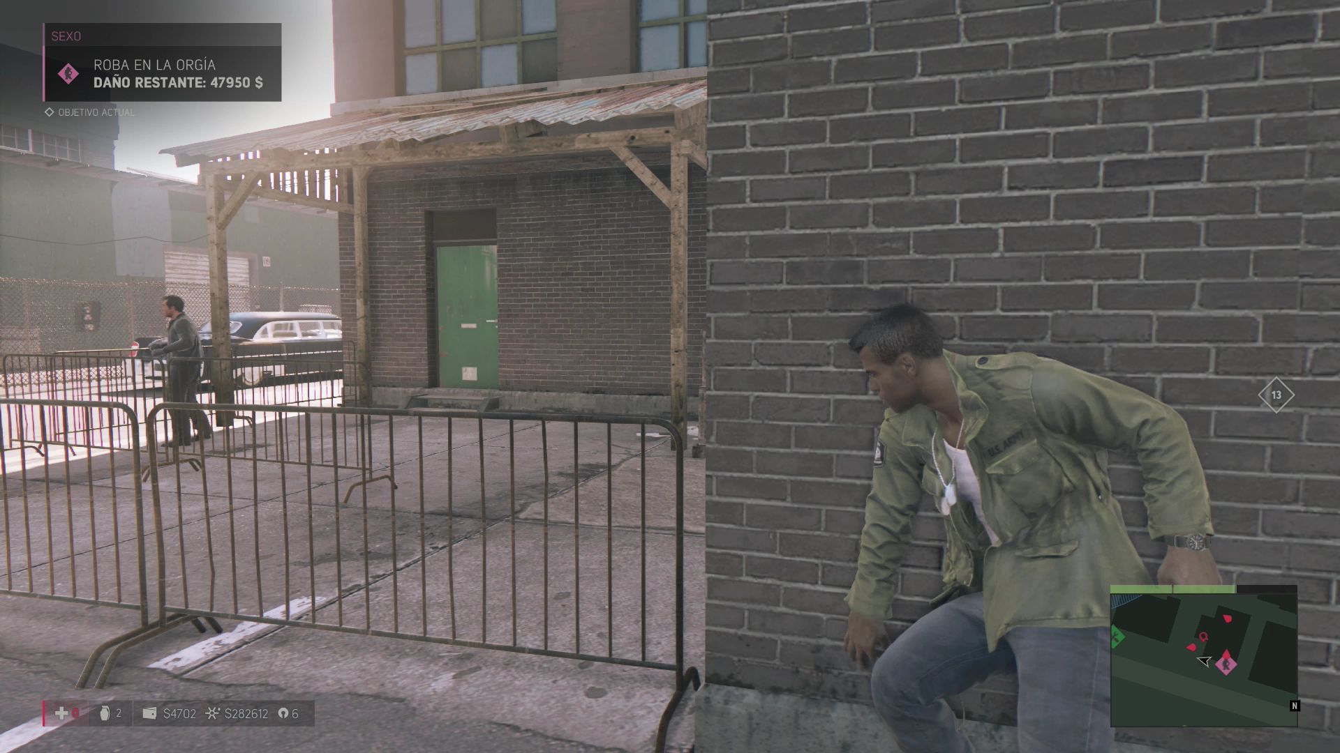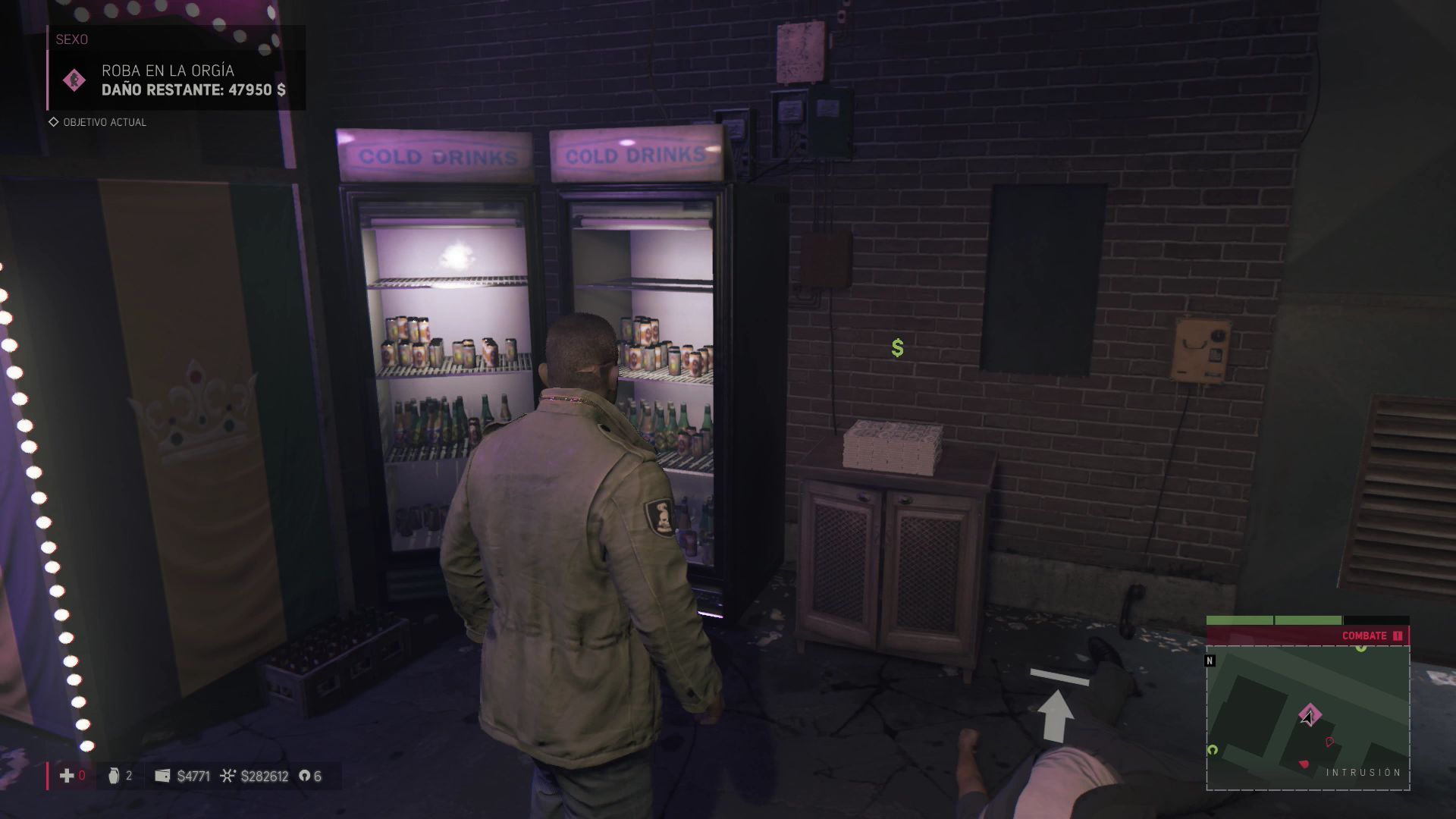 Gracias a la información de los chulos habrás conseguido el objetivo de robar en una orgía. Actívalo y ve al punto que te indican, acaba con el guardia que verás en la puerta y entra en el local. Por grande que parezca el sitio apenas hay tres guardias vigilando la zona, acaba con ellos y recoge todo el dinero que veas por la zona para causar daños al negocio.