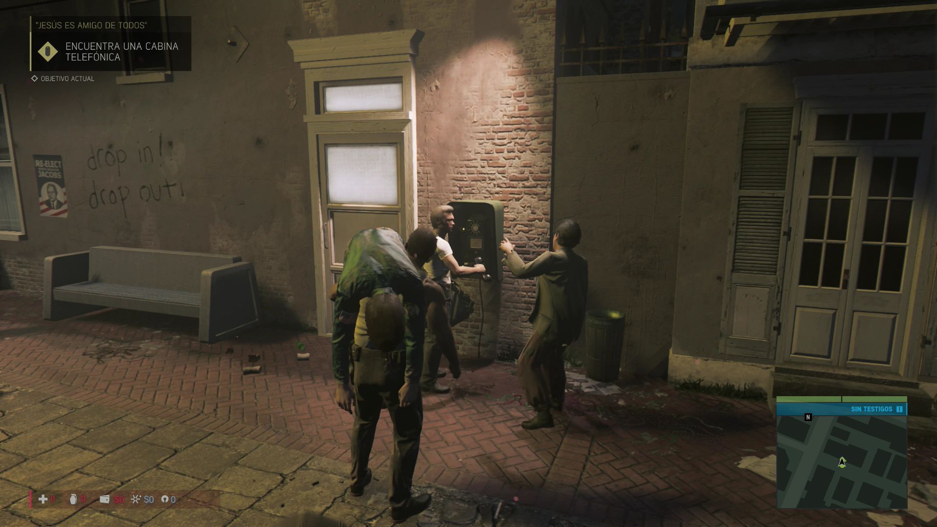 Esta misión comienza de forma automática al completar la anterior. Avanza por la calle junto a tus compañeros y acércate a la cabina telefónica que verás en la fachada de un edificio para realizar la llamada.
