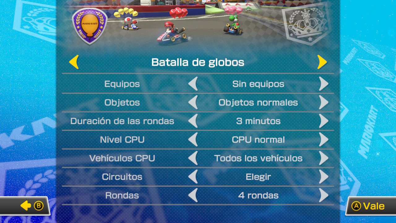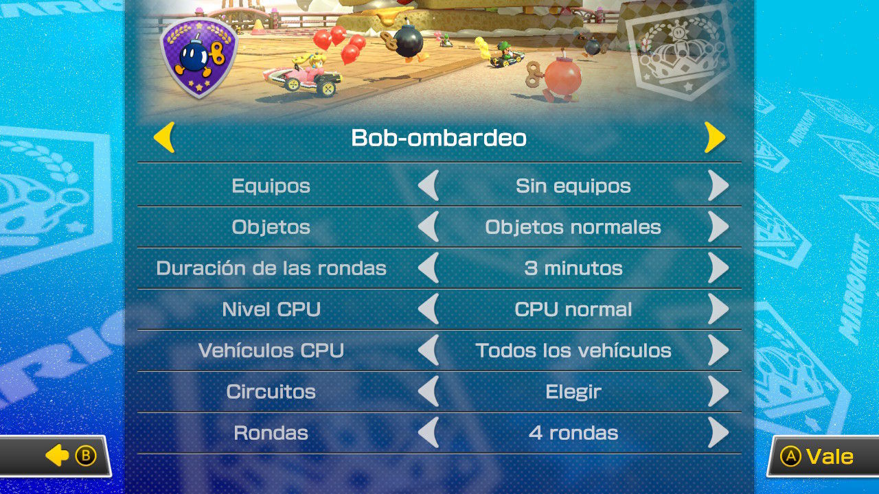 De esta forma, podremos elegir si jugar en equipos o en solitario, los objetos disponibles, la duración de las rondas, el nivel de la CPU, los vehículos que pilotará la CPU, los circuitos y las rondas.