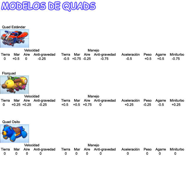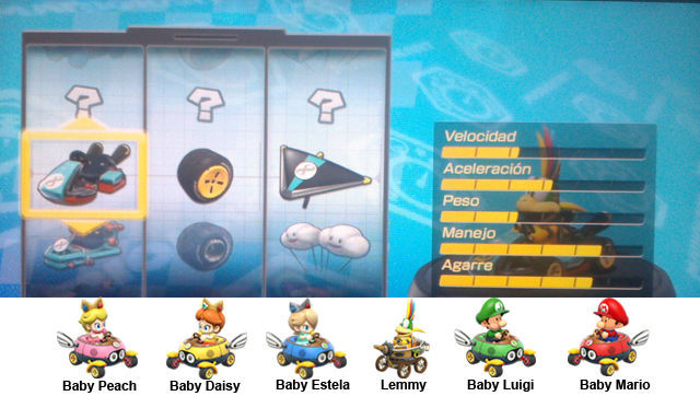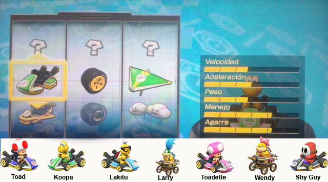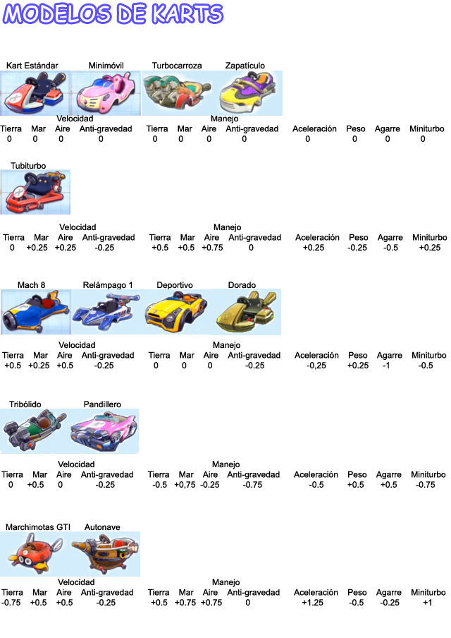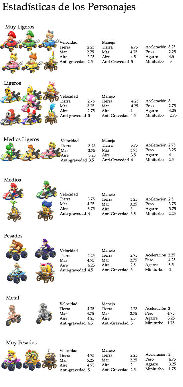 Así que a medida que sube la velocidad baja la aceleración y a medida que sube el peso baja el manejo y viceversa, también los más ligeros tienen más Miniturbo y más Agarre.