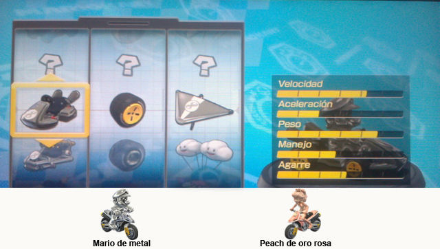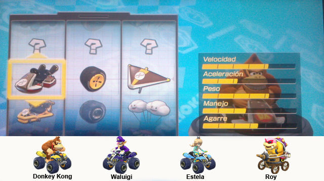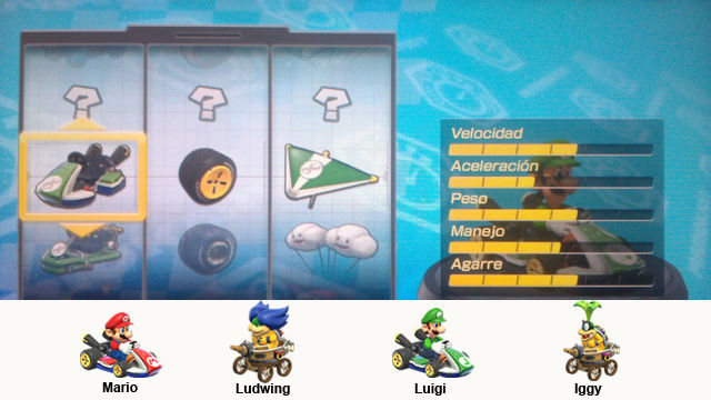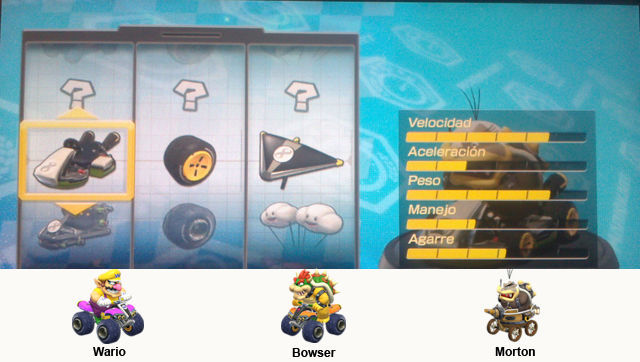 En Mario Kart 8 se pueden configurar los vehículos de muchas maneras, además de elegir entre Karts, Motos y Quads, podemos cambiar entre una gran variedad de ruedas y de alas, lo que irá modificando nuestros atributos. Así a los personajes ligeros podemos subirle la velocidad, potenciar lo que queramos en los medios y darles mas aceleración o manejo a los pesados, para las pruebas de contrarreloj siempre la velocidad máxima que podamos, para Grand Prix y carreras online con objetos es bueno tener una aceleración y velocidad decentes, pero nunca podremos tener ambas altas.