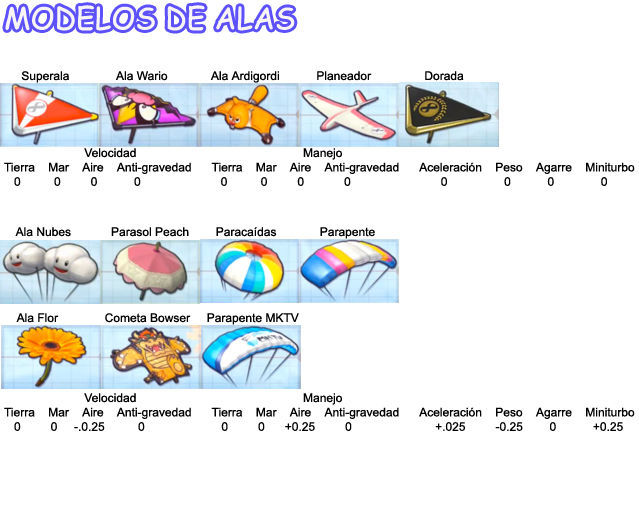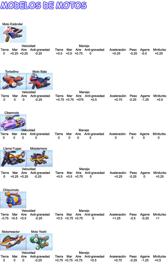 Manejo: igualmente que con Velocidad la hay de 4 tipos y solo vemos el de tierra, también lo tenemos de mar, aire y antigravedad. Con los personajes ligeros tenemos mucho manejo pero tienen menor velocidad.