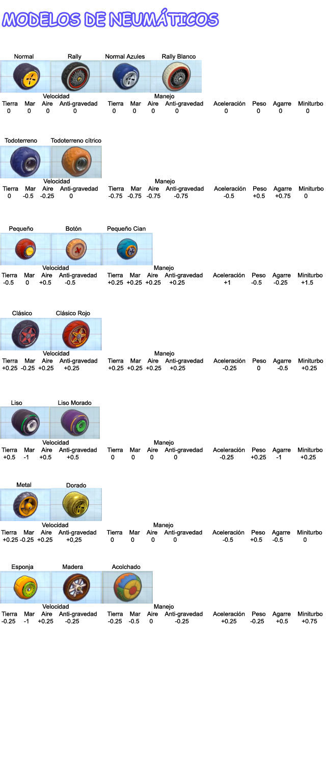 Aumentan la velocidad en tierra, aire y antigravedad, la disminuye en mar. Aumenta el miniturbo y el peso, disminuye el agarre y la aceleración.