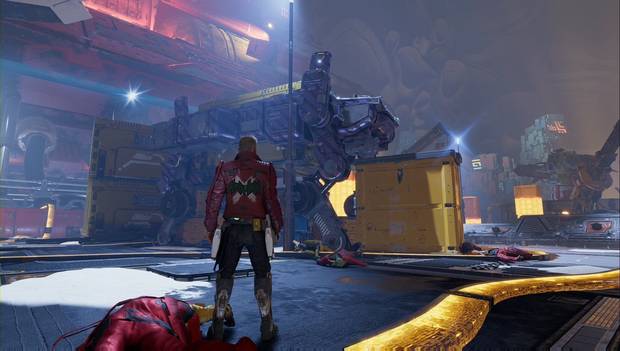 Este atuendo se consigue durante el Capitulo 12. Nada más aterrizar en Sapiencial y eliminar a los enemigos, debes buscar un contenedor bajo uno de los robots (aparece marcado en amarillo) que puedes mover con Drax.