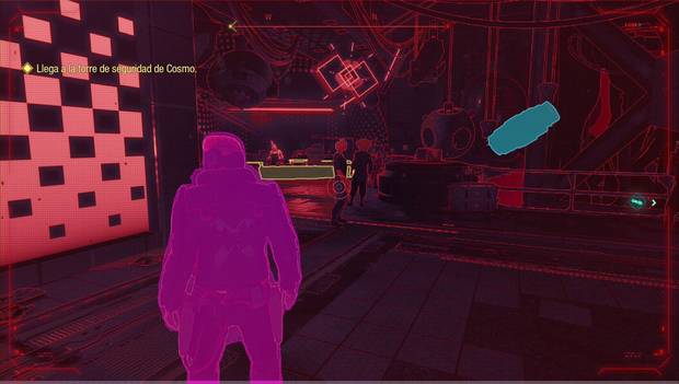 Recuerda que la ventaja Escáner táctico te muestra la ubicación de componentes cercanos. Lo decimos porque es complicado darte indicaciones exactas en un sitio así de abierto. Ve hacia la derecha de la puerta de energía roja para avanzar.