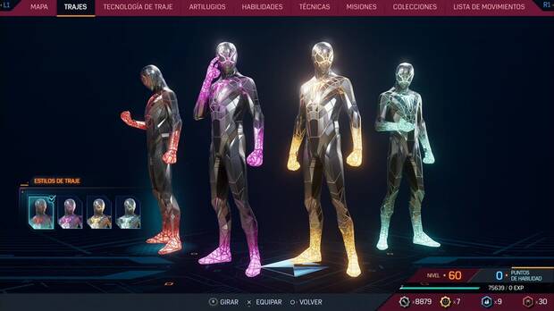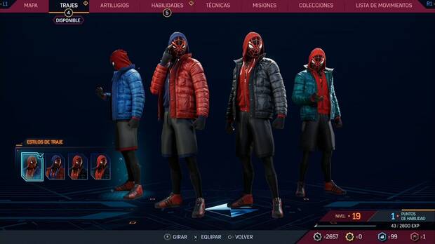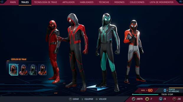 Entre los 68 trajes diferentes que hay en Marvel's Spider-Man 2, Miles Morales puede usar 34 atuendos (algunos de los cuales con hasta 4 estilos diferentes), correspondiendo los otros 34 a los trajes de Peter. En esta ocasión los trajes no tienen efectos especiales, son estéticos, a diferencia de la primera entreja. Aquí podrás ver todos los trajes y sus estilos, por si no quieres gastar materiales en algo que a lo mejor no te gusta.