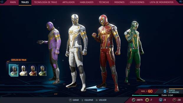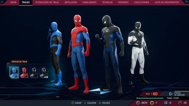 Entre los 68 trajes diferentes que hay en Marvel's Spider-Man 2, Peter Parker puede usar 34 atuendos (algunos de los cuales con hasta 4 estilos diferentes), correspondiendo los otros 34 a los trajes de Miles. En esta ocasión los trajes no tienen efectos especiales, son estéticos, a diferencia de la primera entreja. Aquí podrás ver todos los trajes y sus estilos, por si no quieres gastar materiales en algo que a lo mejor no te gusta.