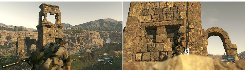 Estos dos objetivos pueden realizarse a la vez de una manera muy sencilla, la gran mayoría de ruinas en el área de combate tienen alguna piedra que desmorona la estructura si la disparamos (normalmente cerca de arcos veremos una piedra un poco más amarilla que las demás y se intuye que disparándola cae). Si Quiet esta cerca de uno de estos puntos el derrumbe le causará daño, hay que estar muy atento a su posición, y si no está cerca de una hacemos que se mueva (durante el combate acaba poniéndose en casi todas).