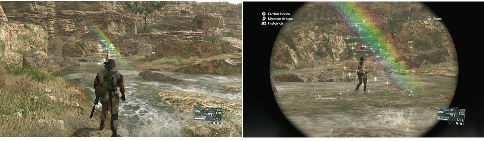 Cuando empiece a tener poca salud, las marcas en el mapa con R, son lugares donde Quiet recupera su energía, en cuanto haga esto hay que ir a por ella rápido y no dejarla que se recupere, es muy vulnerable en este momento mientras esta bailando con el arcoíris.