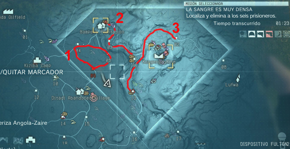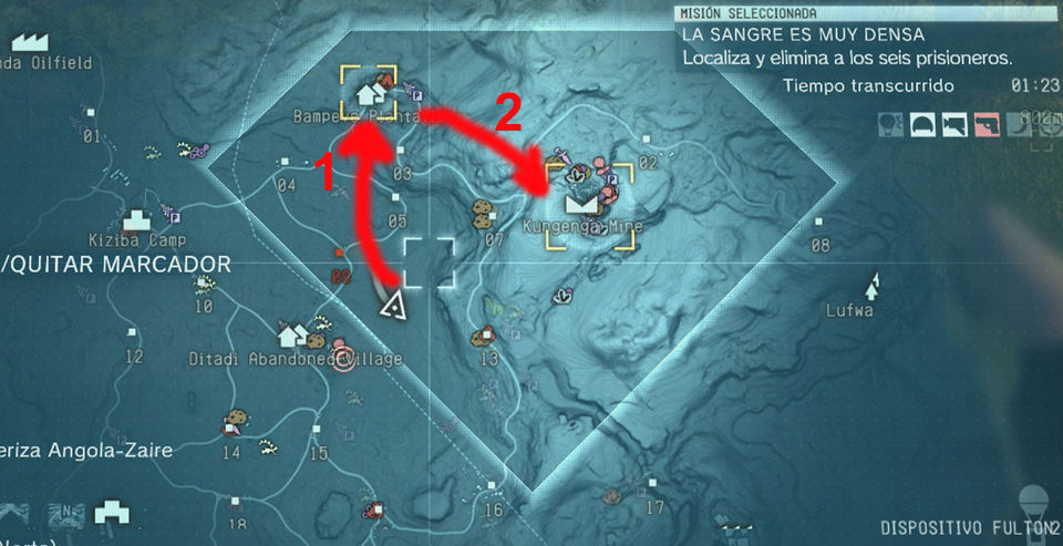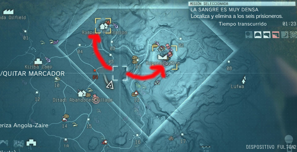 Al comenzar la misión tenemos dos puntos marcados en amarillo, uno en la Plantación de Bampeve y otro en la Mina de Kungenga, primeramente nos dirigimos hasta la plantación.